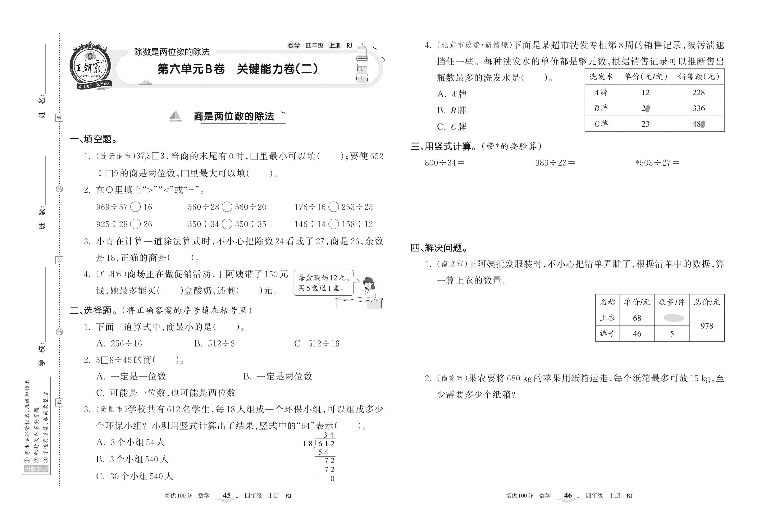 2022上册四年级数学人教版 第六单元B卷 关键能力卷(二)