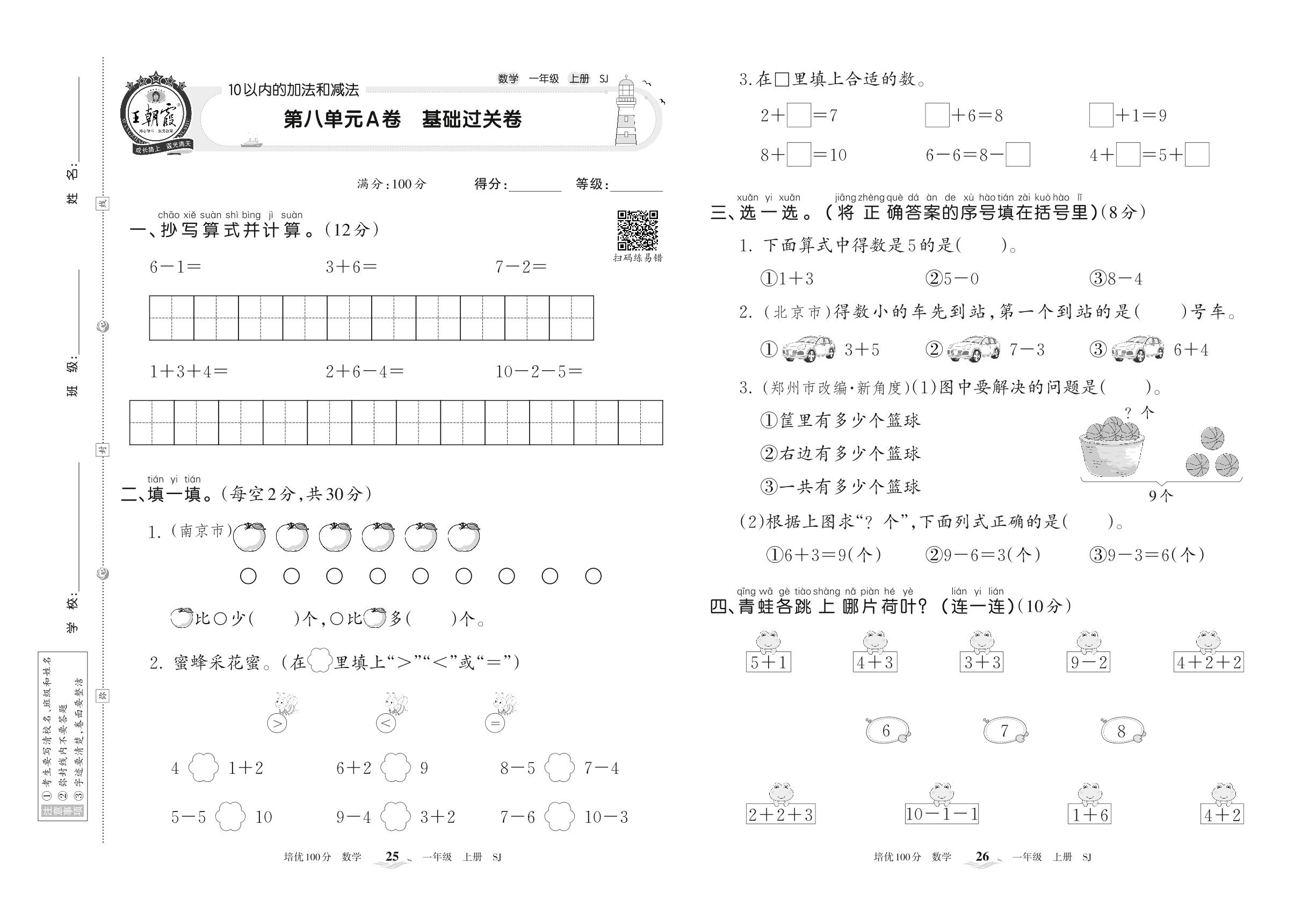 2022上册一年级数学苏教版 第八单元A卷 基础过关卷