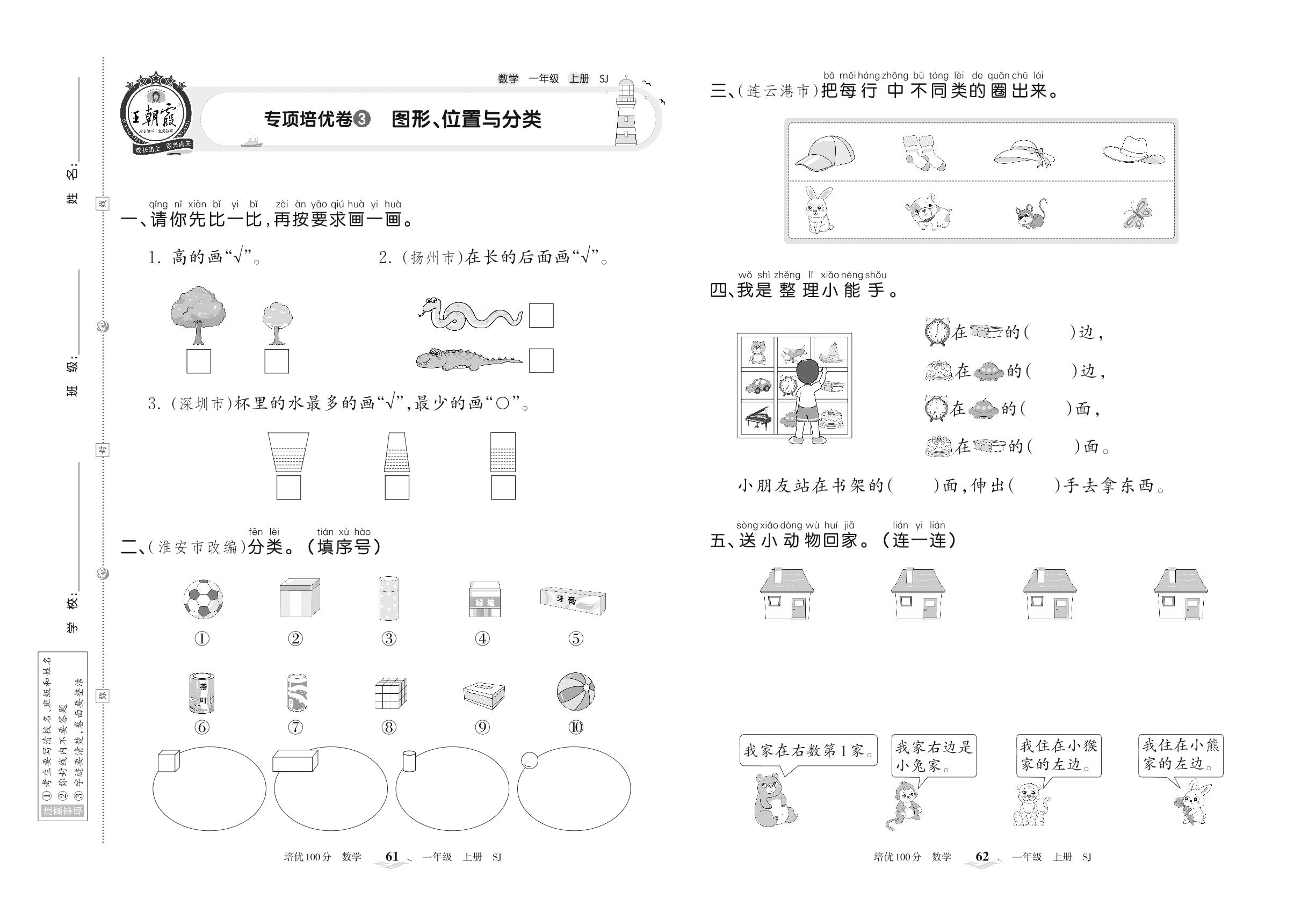 2022上册一年级数学苏教版 专项培优卷3 图形、位置与分类