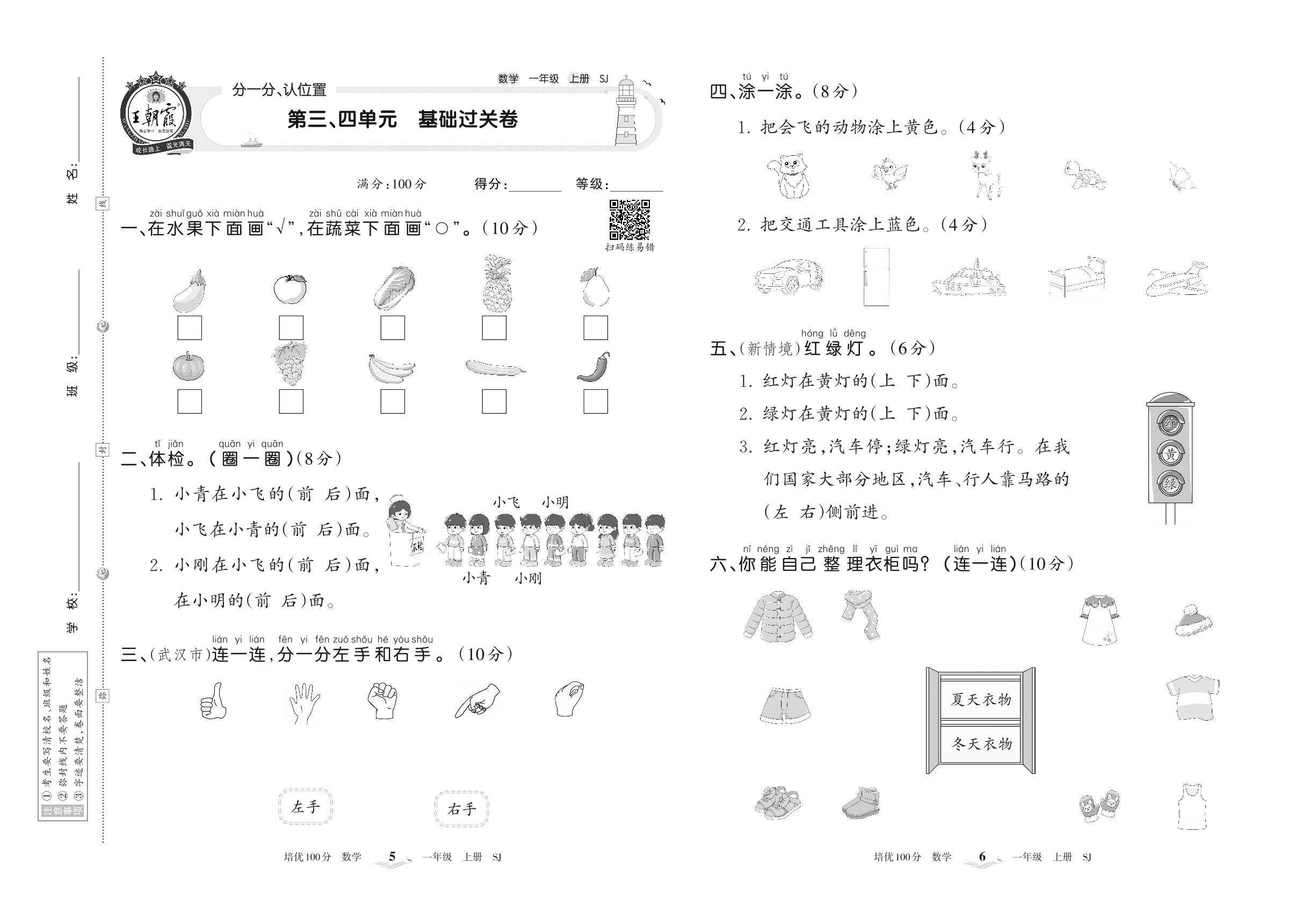 2022上册一年级数学苏教版 第三、四单元 基础过关卷