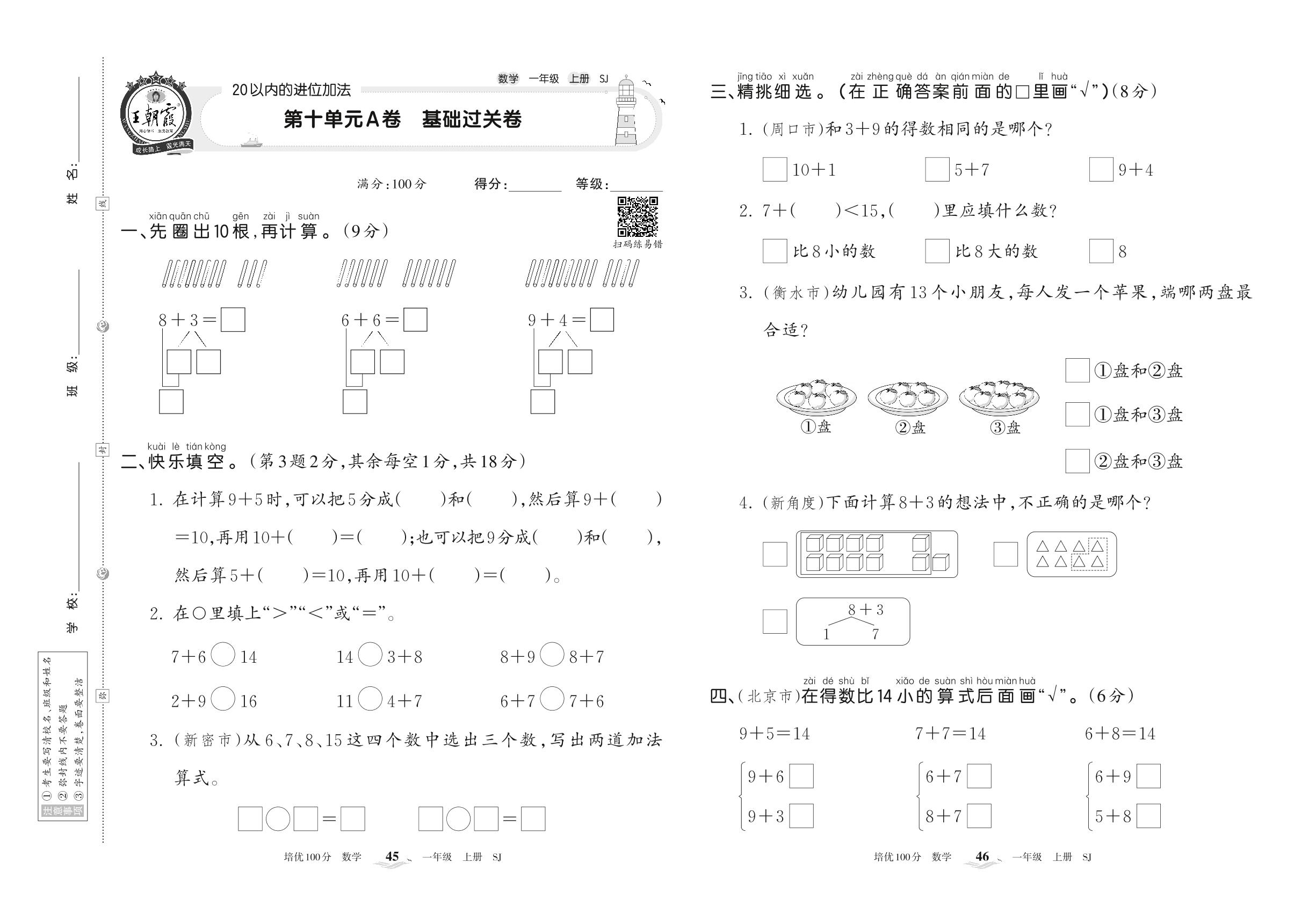2022上册一年级数学苏教版 第十单元A卷 基础过关卷