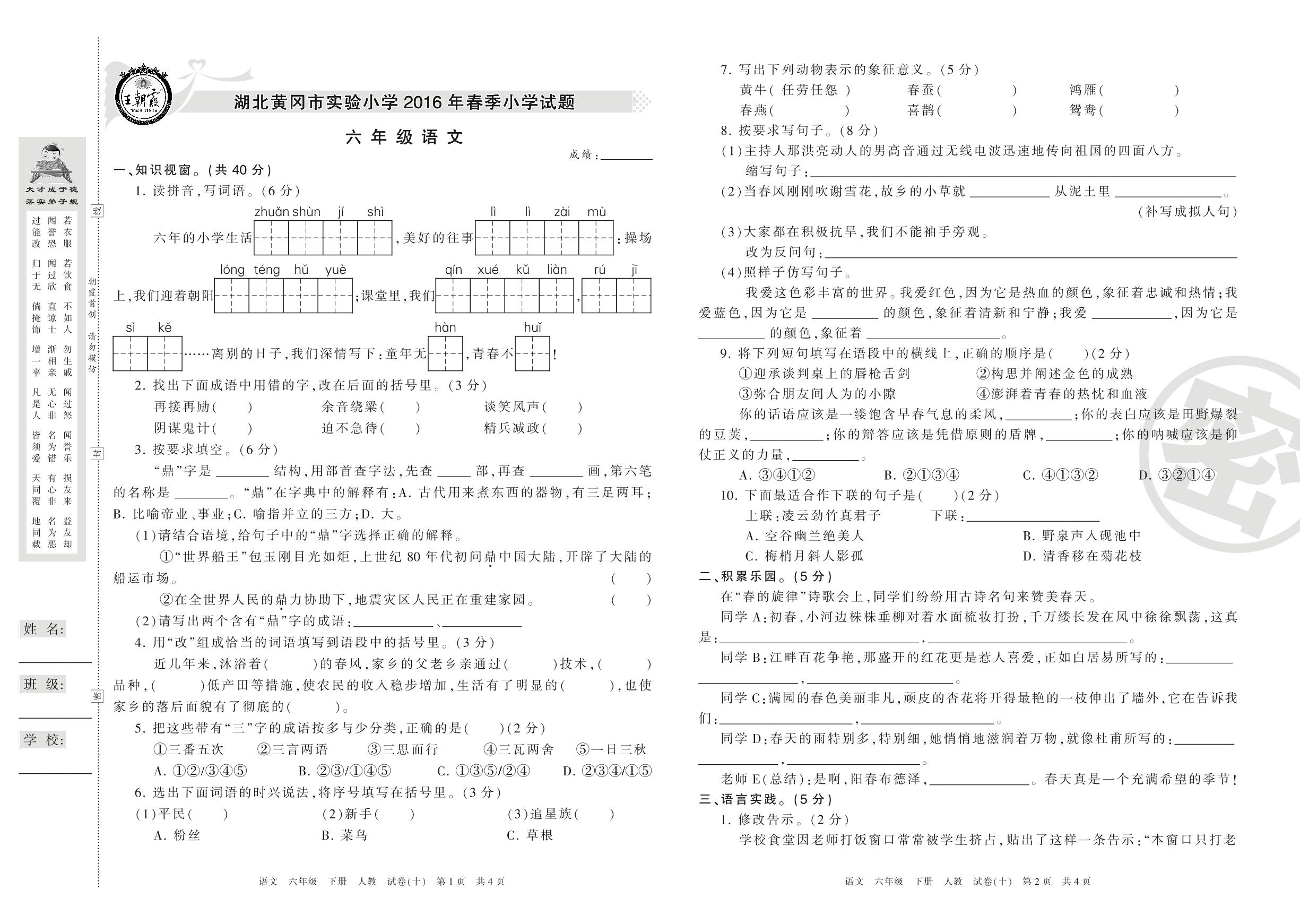 2015-2016学年第二学期湖北黄冈市实验小学六年级语文试卷(人教版)【10】