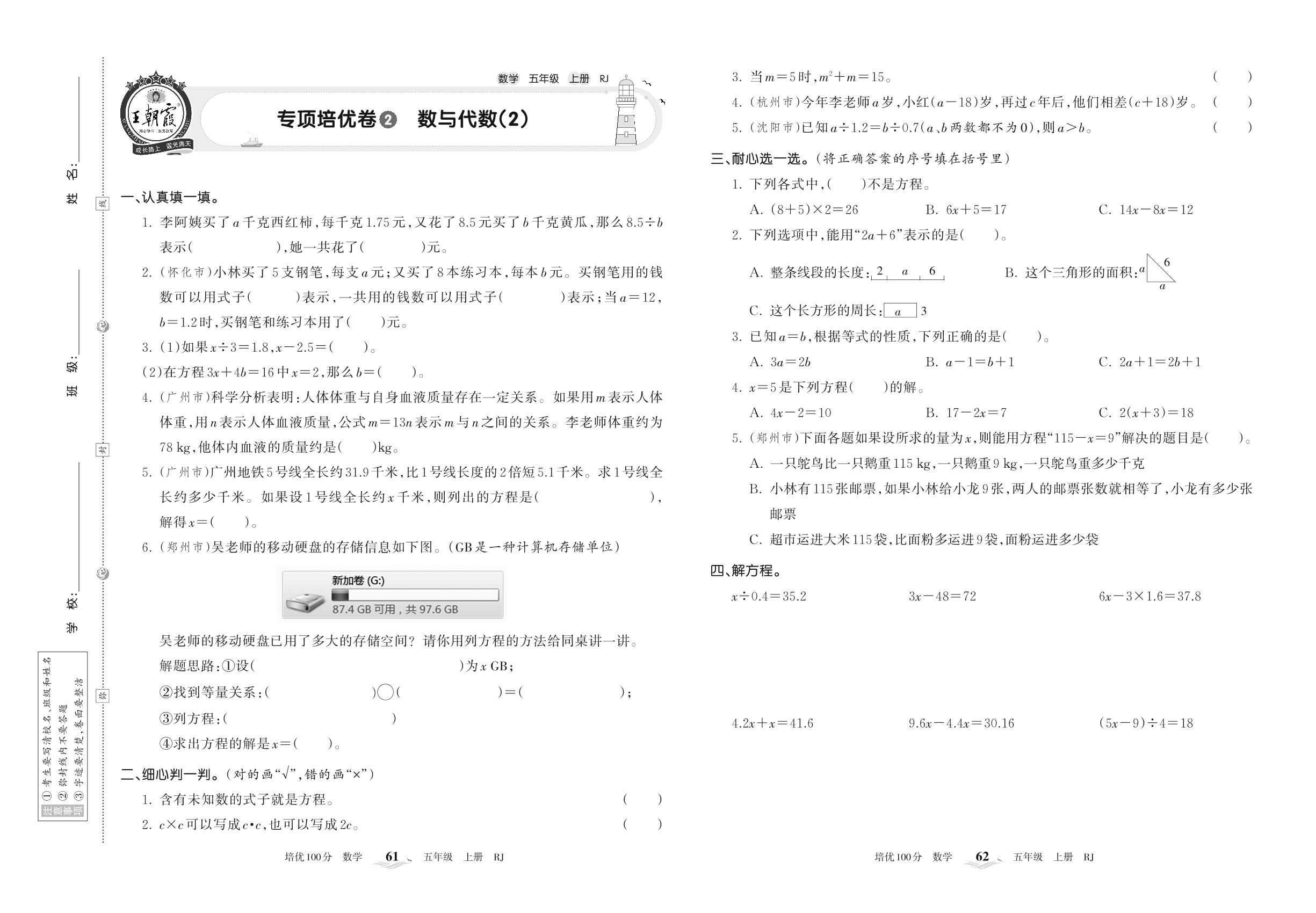 2022上册五年级数学人教版 专项培优卷2 数与代数(2)
