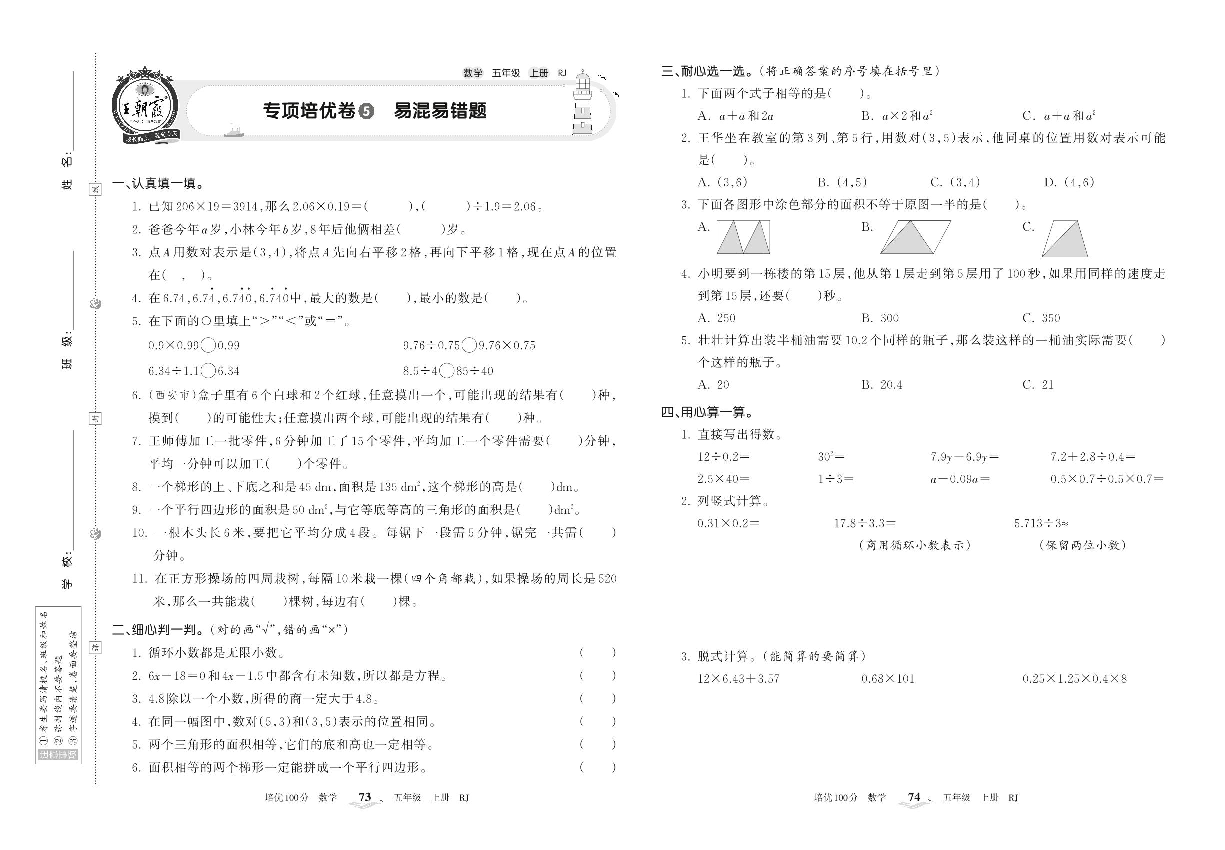 2022上册五年级数学人教版 专项培优卷5 易混易错题