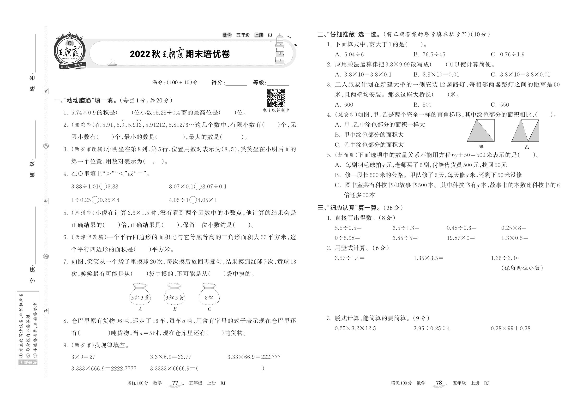2022上册五年级数学人教版 2022秋王朝霞期末培优卷