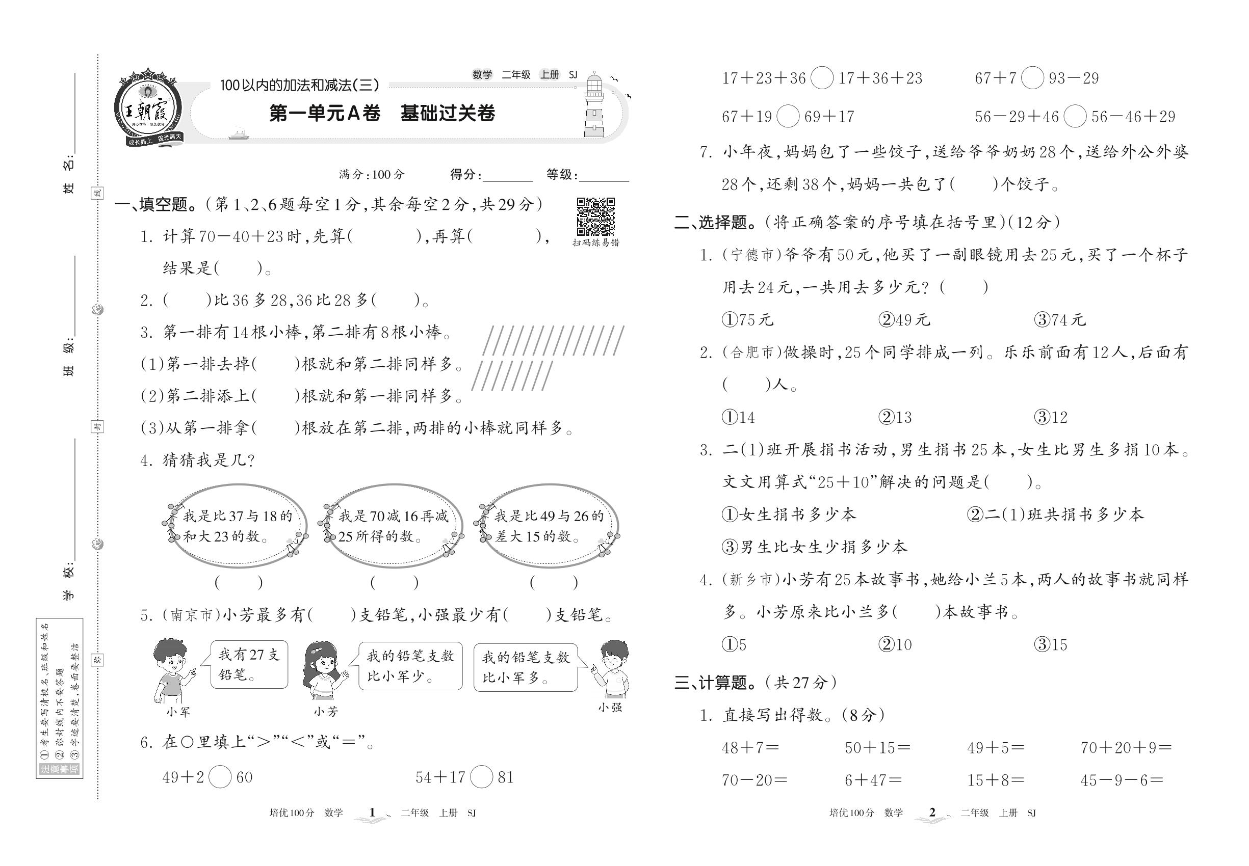 2022上册二年级数学苏教版 第一单元A卷 基础过关卷