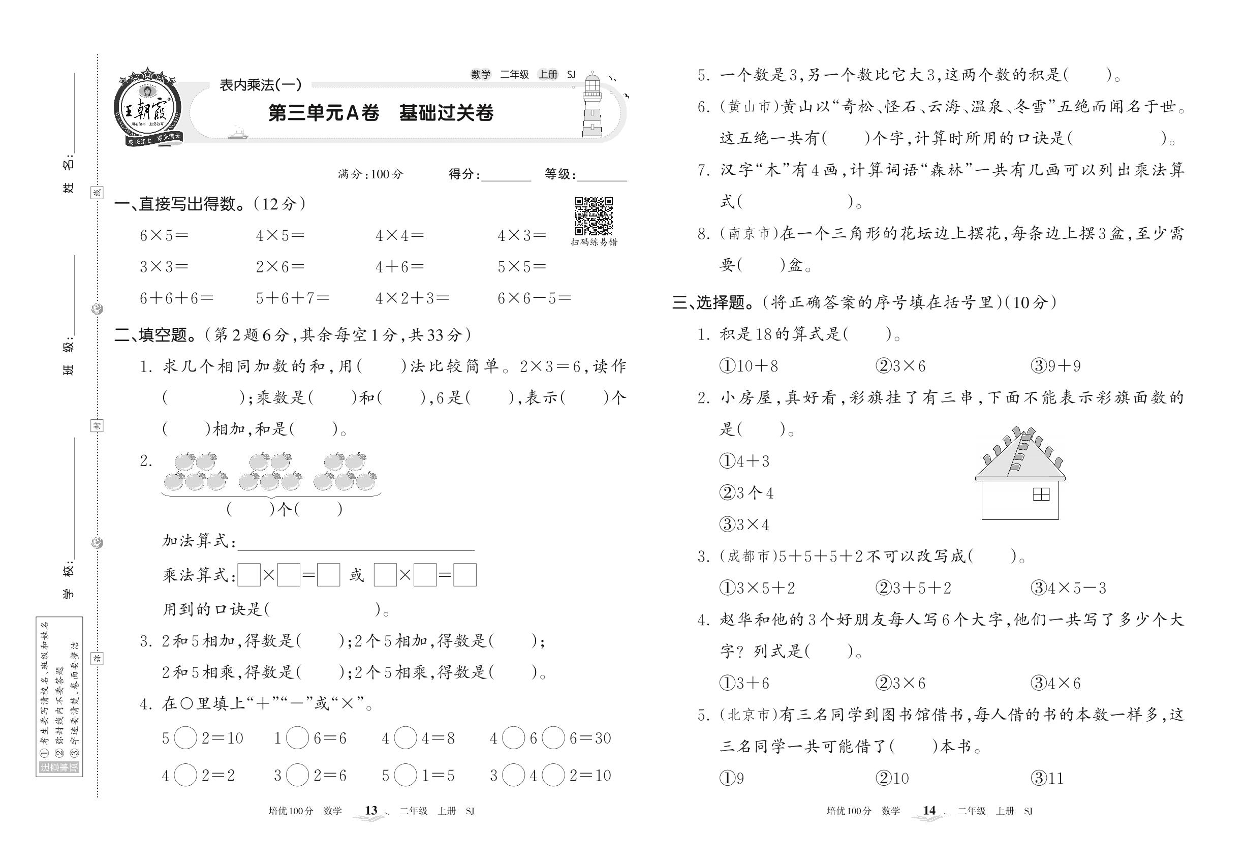 2022上册二年级数学苏教版 第三单元A卷 基础过关卷