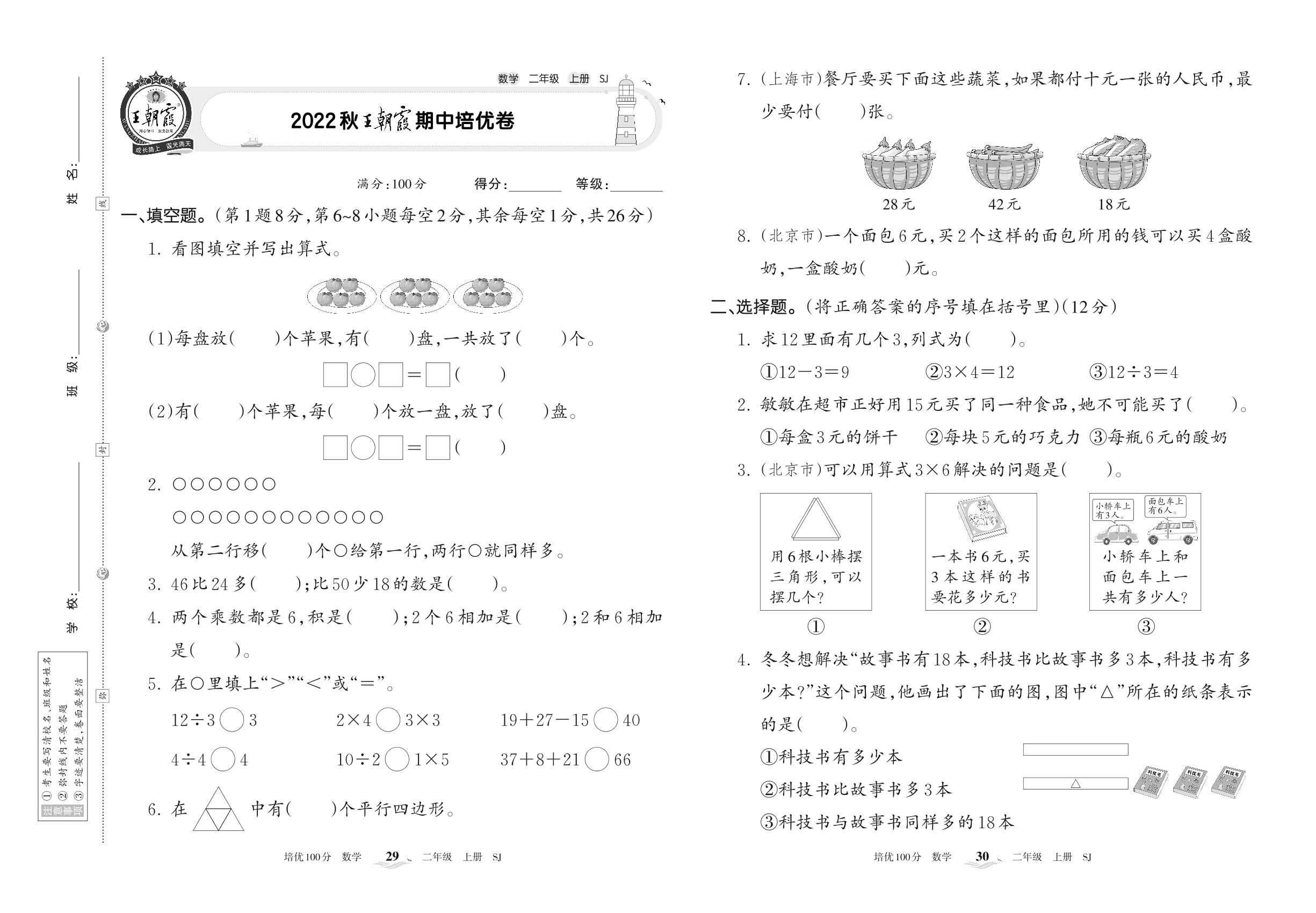 2022上册二年级数学苏教版 2022秋王朝霞期中培优卷