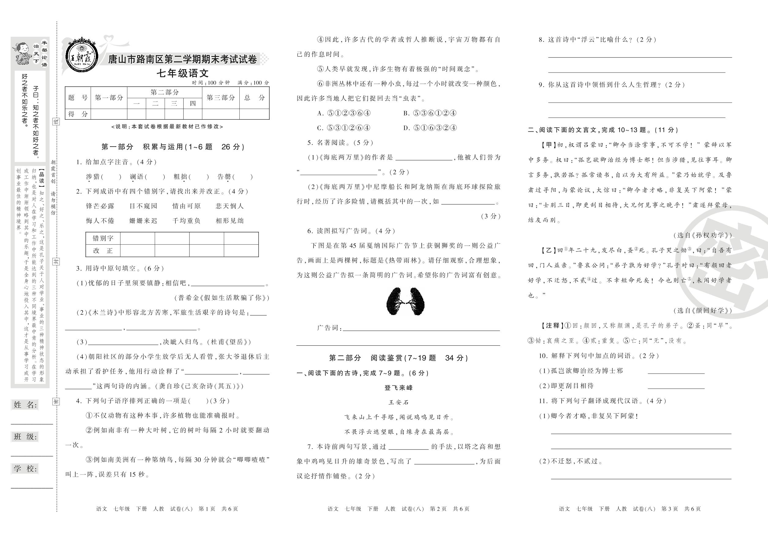 七年级语文人教版下册期末卷