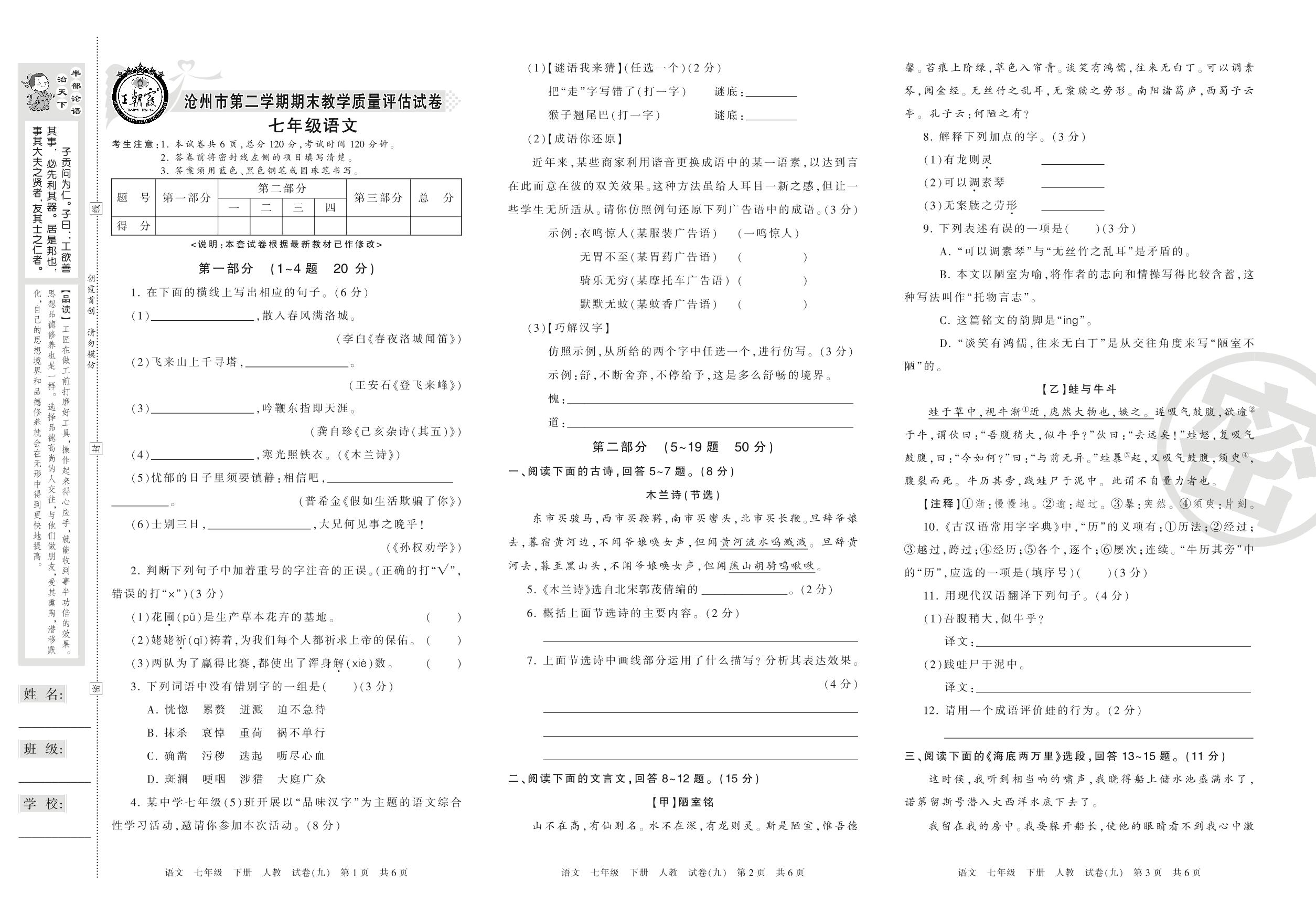 七年级语文人教版下册期末卷