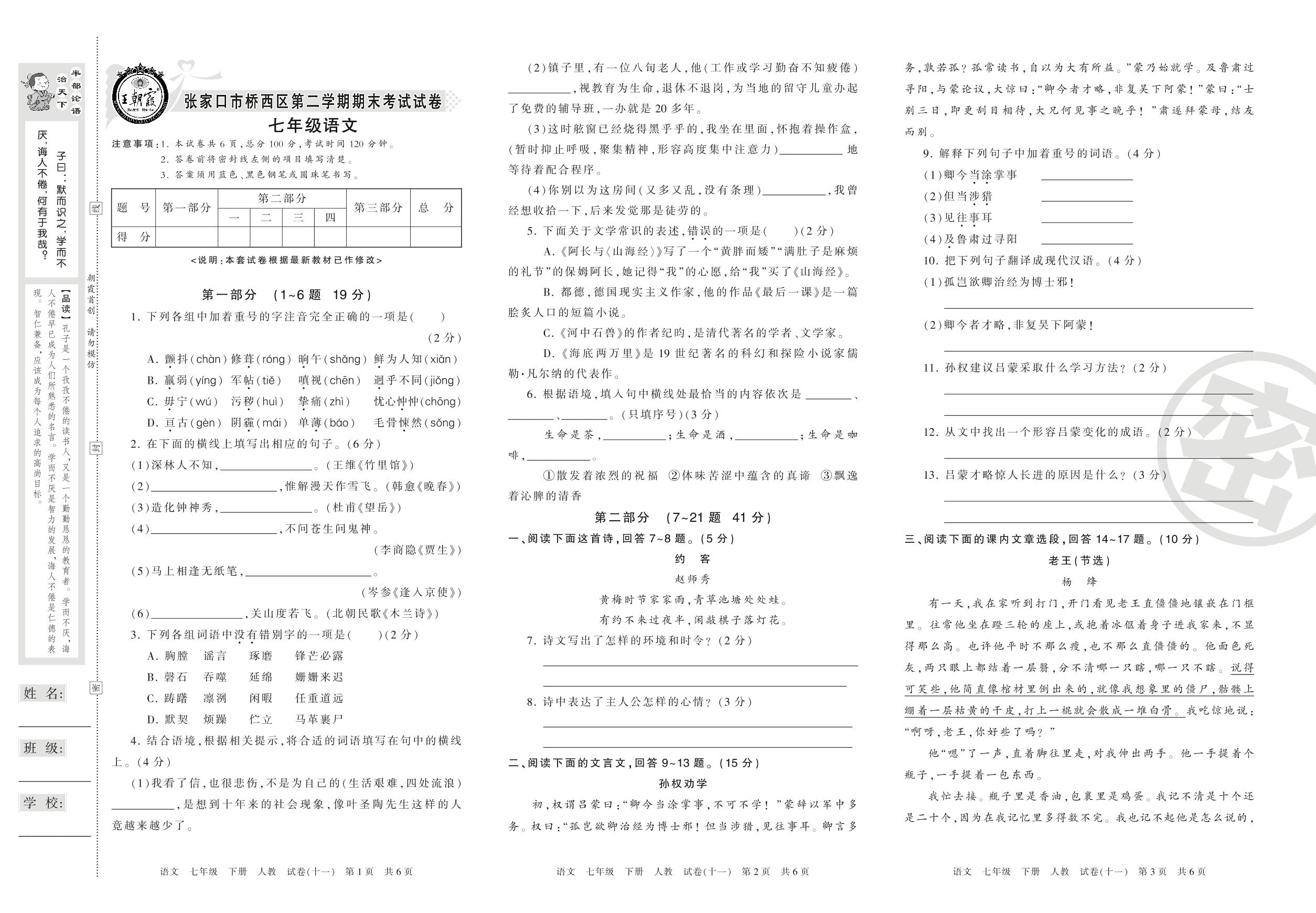 2015-2016学年第二学期张家口市桥西区七年级语文试卷(人教版)【11】