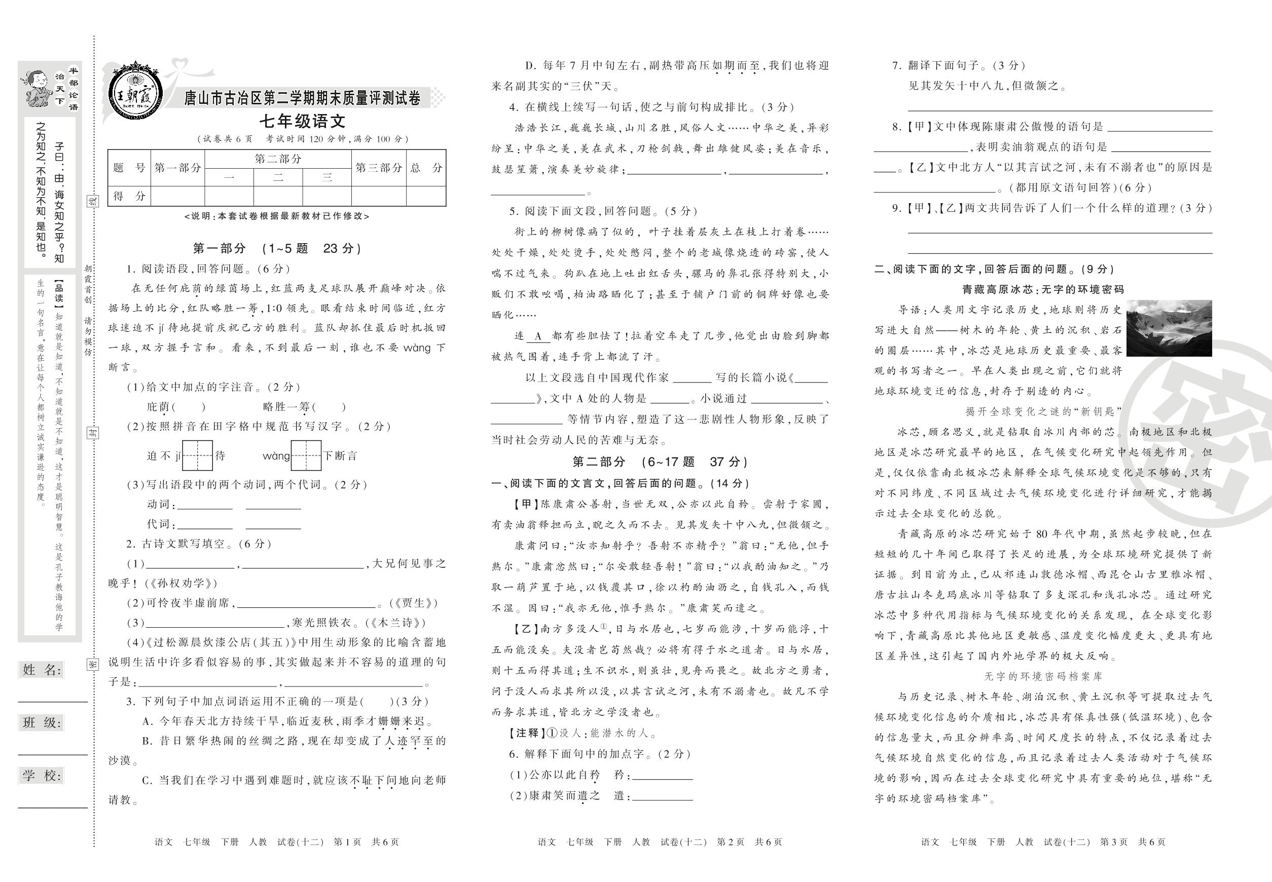 2015-2016学年第二学期唐山市古冶区七年级语文试卷(人教版)【12】