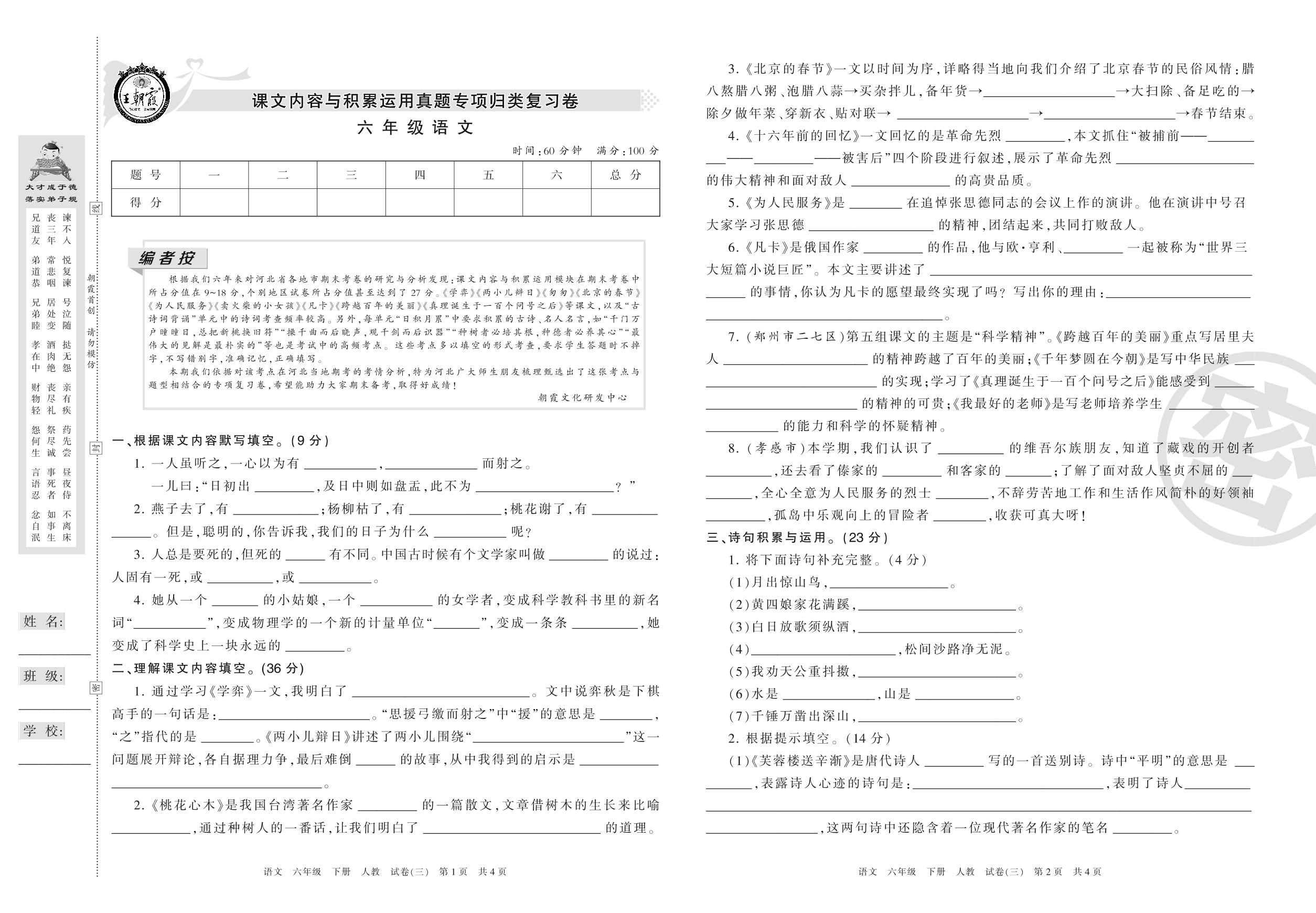 王朝霞期末专项卷六年级下册语文(人教版)_R21080251206【3】
