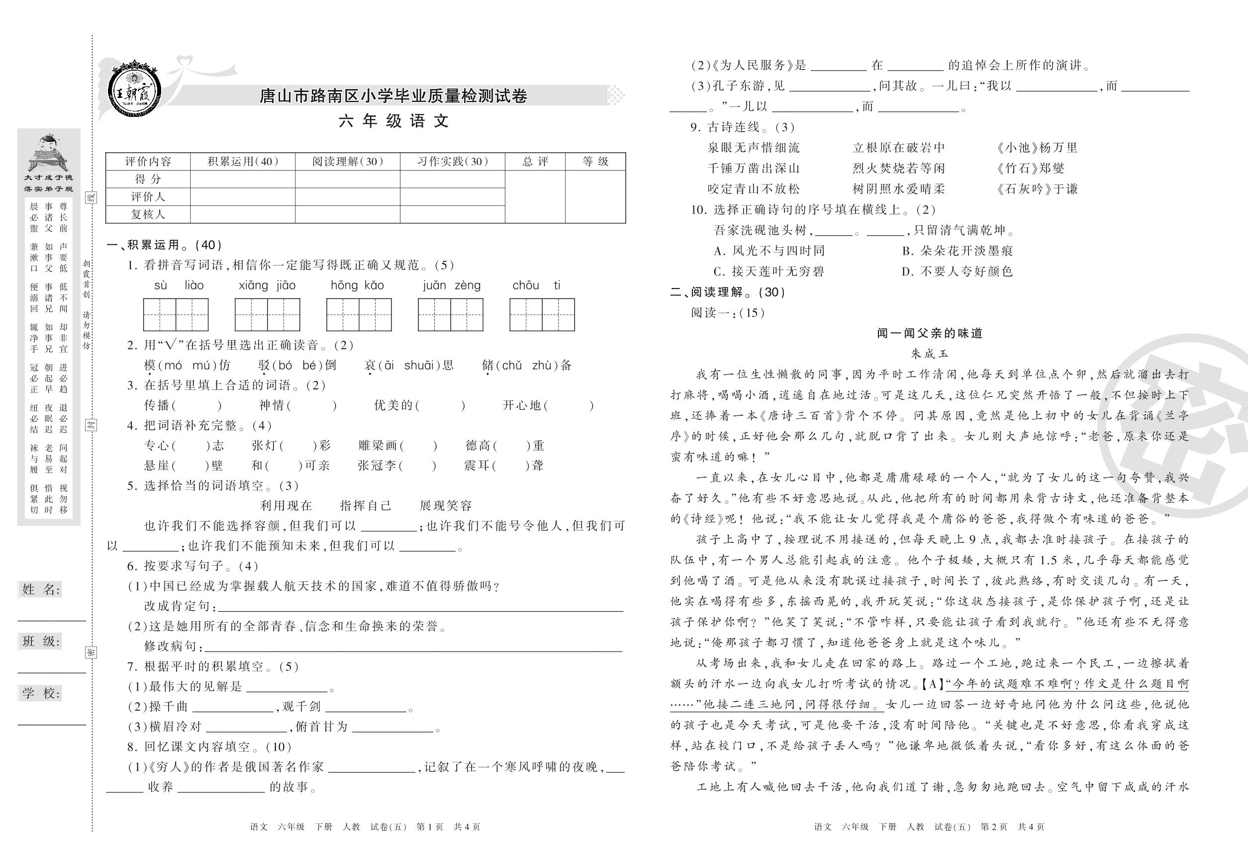 2015-2016学年第二学期唐山市路南区六年级语文试卷(人教版)【5】