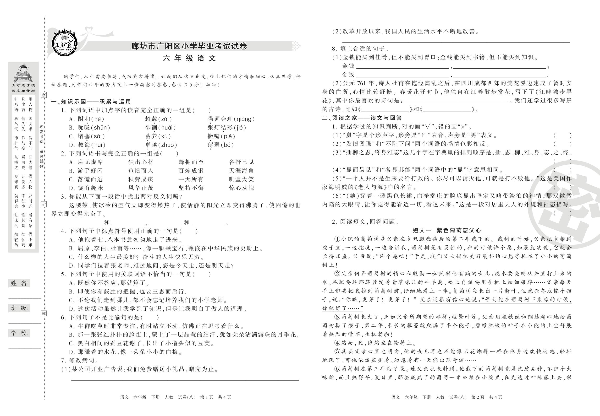 2015-2016学年第二学期廊坊市广阳区六年级语文试卷(人教版)【8】