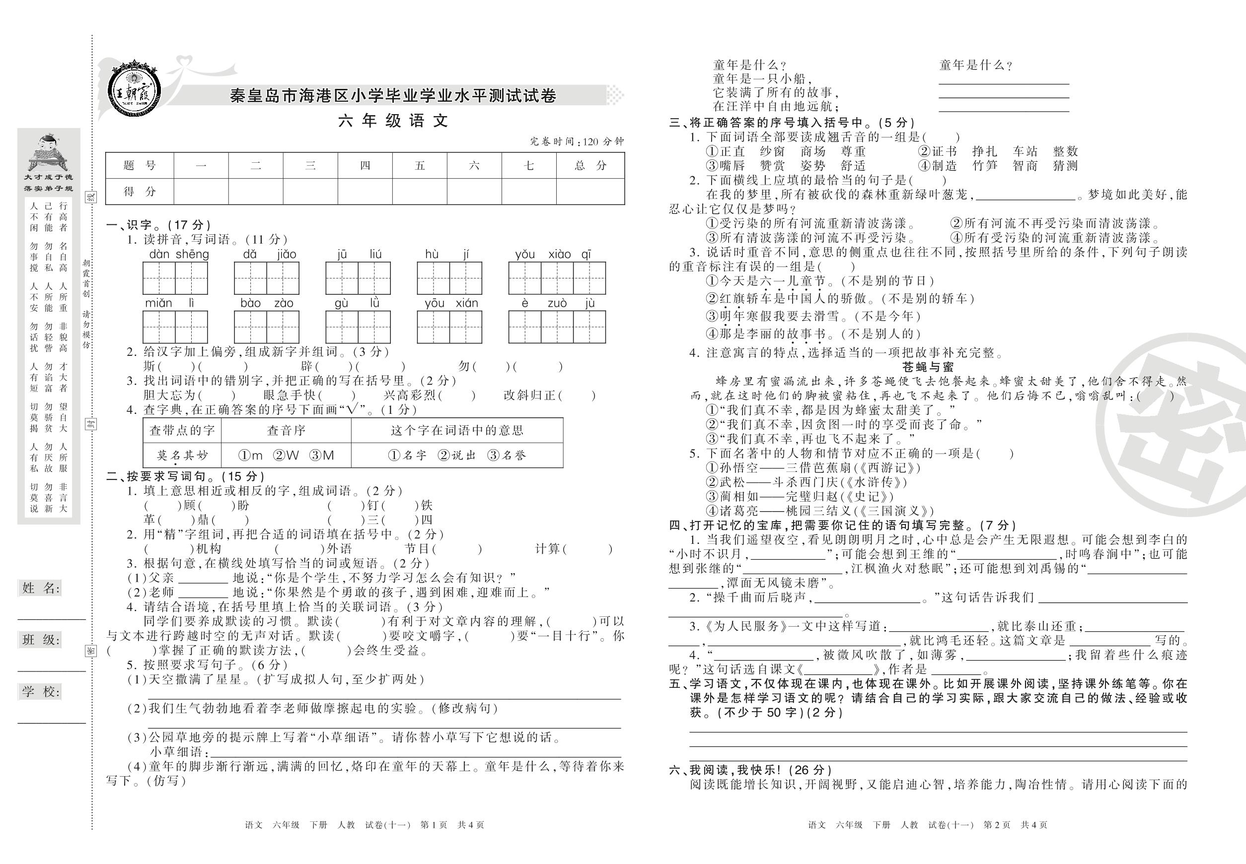 2015-2016学年第二学期秦皇岛市海港区六年级语文试卷(人教版)【11】
