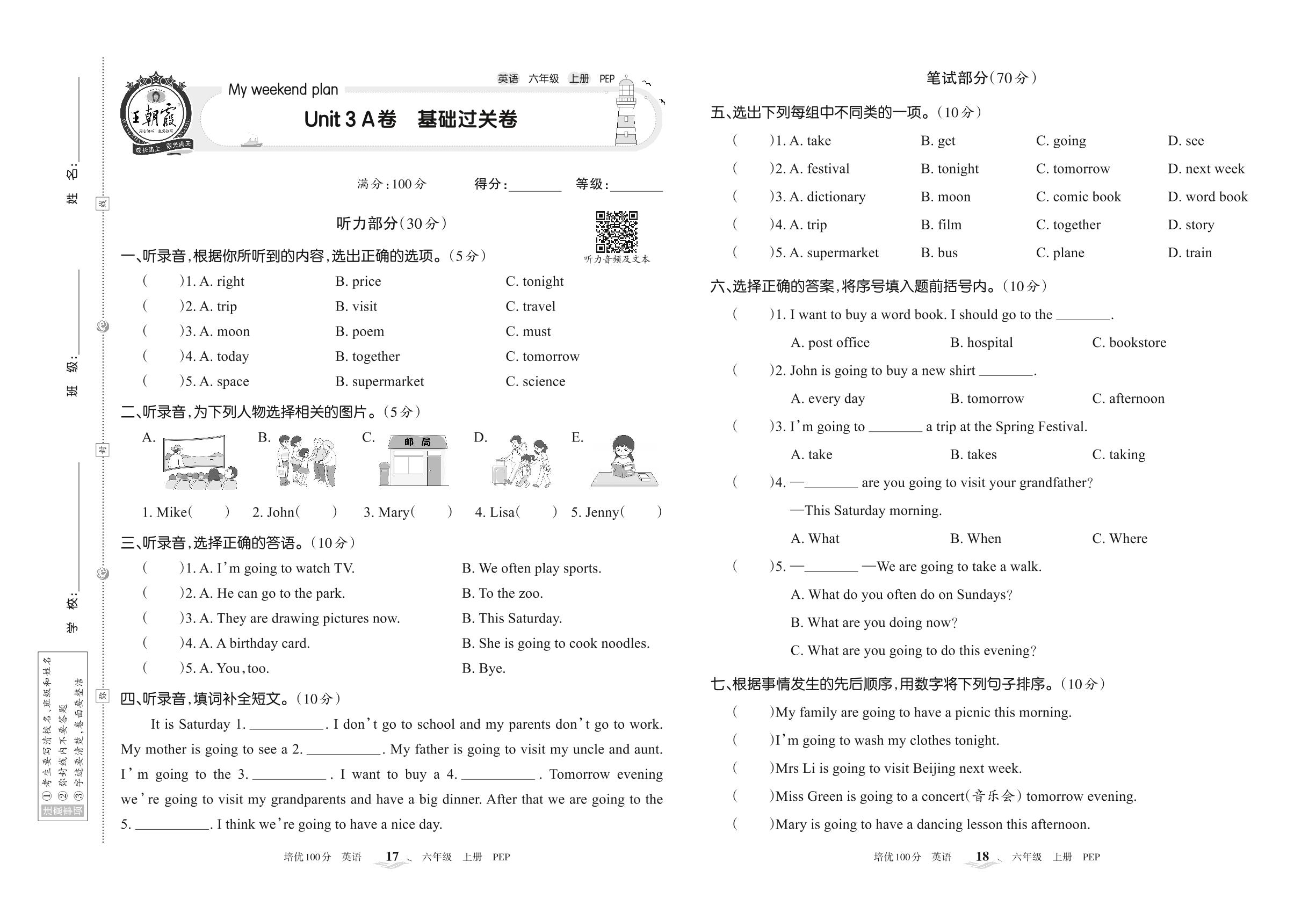 2022上册六年级英语人教PEP版 Unit 3 A卷 基础过关卷
