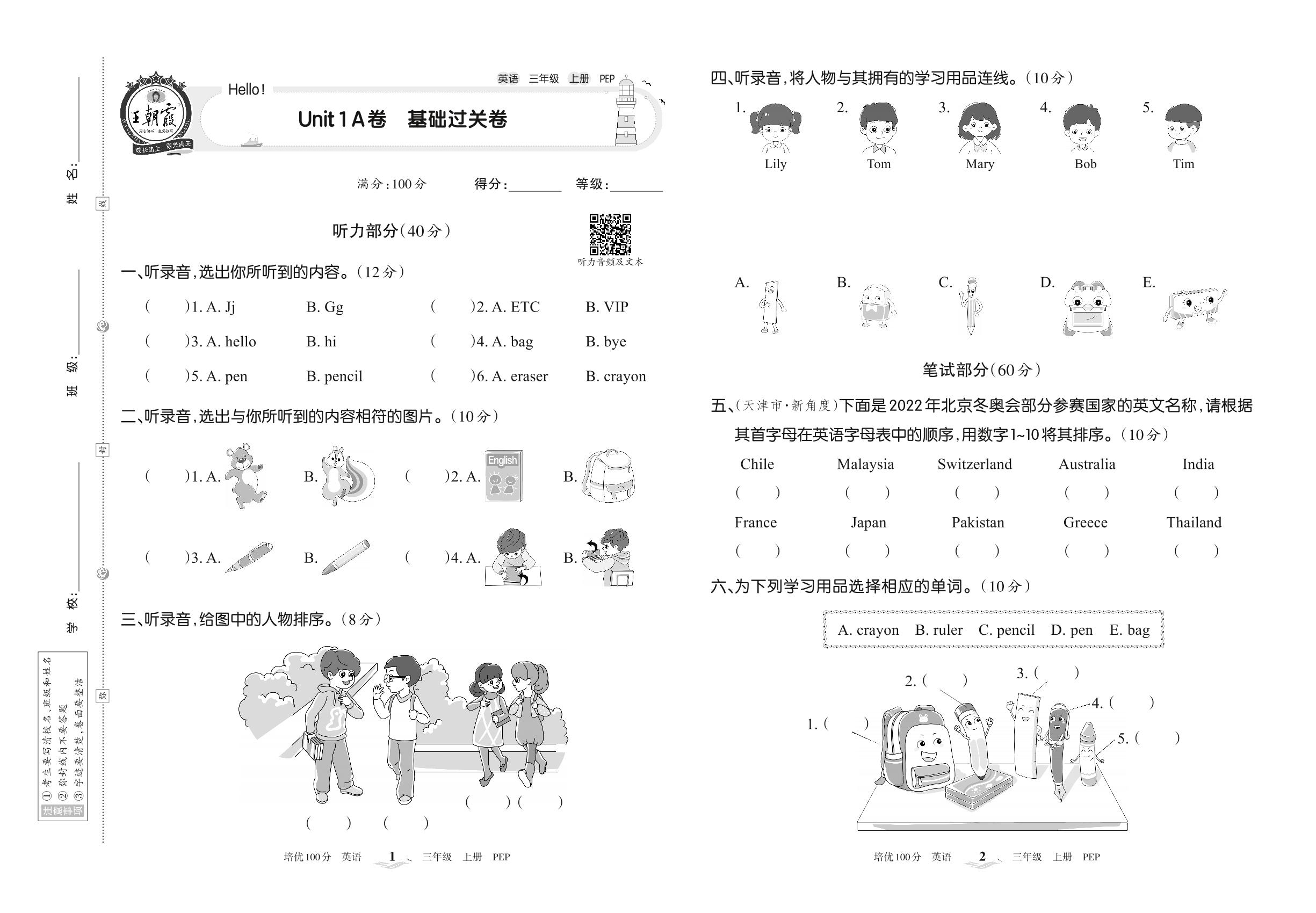2022上册三年级英语人教PEP版 Unit 1 A卷 基础过关卷