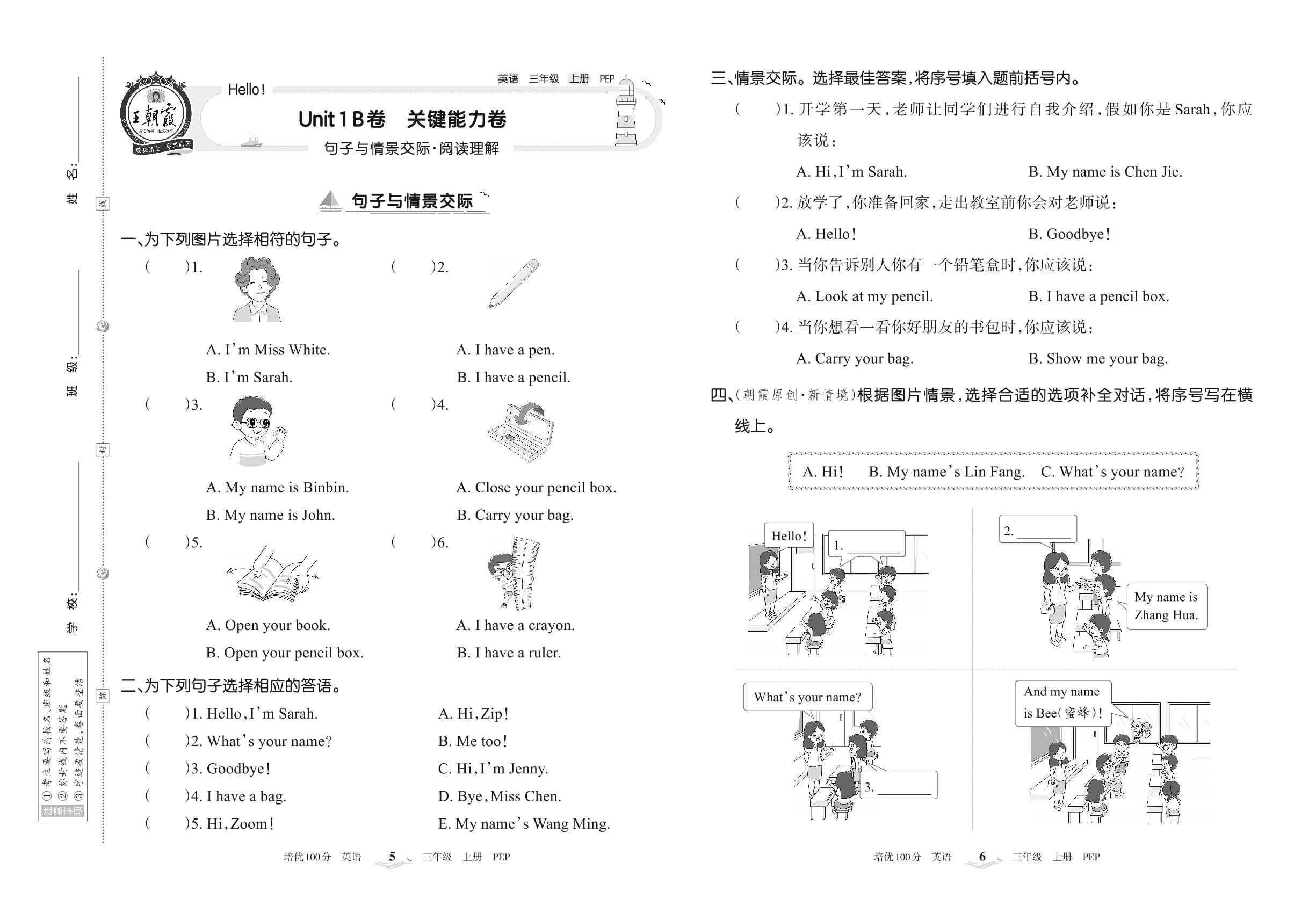 2022上册三年级英语人教PEP版 Unit 1 B卷 关键能力卷