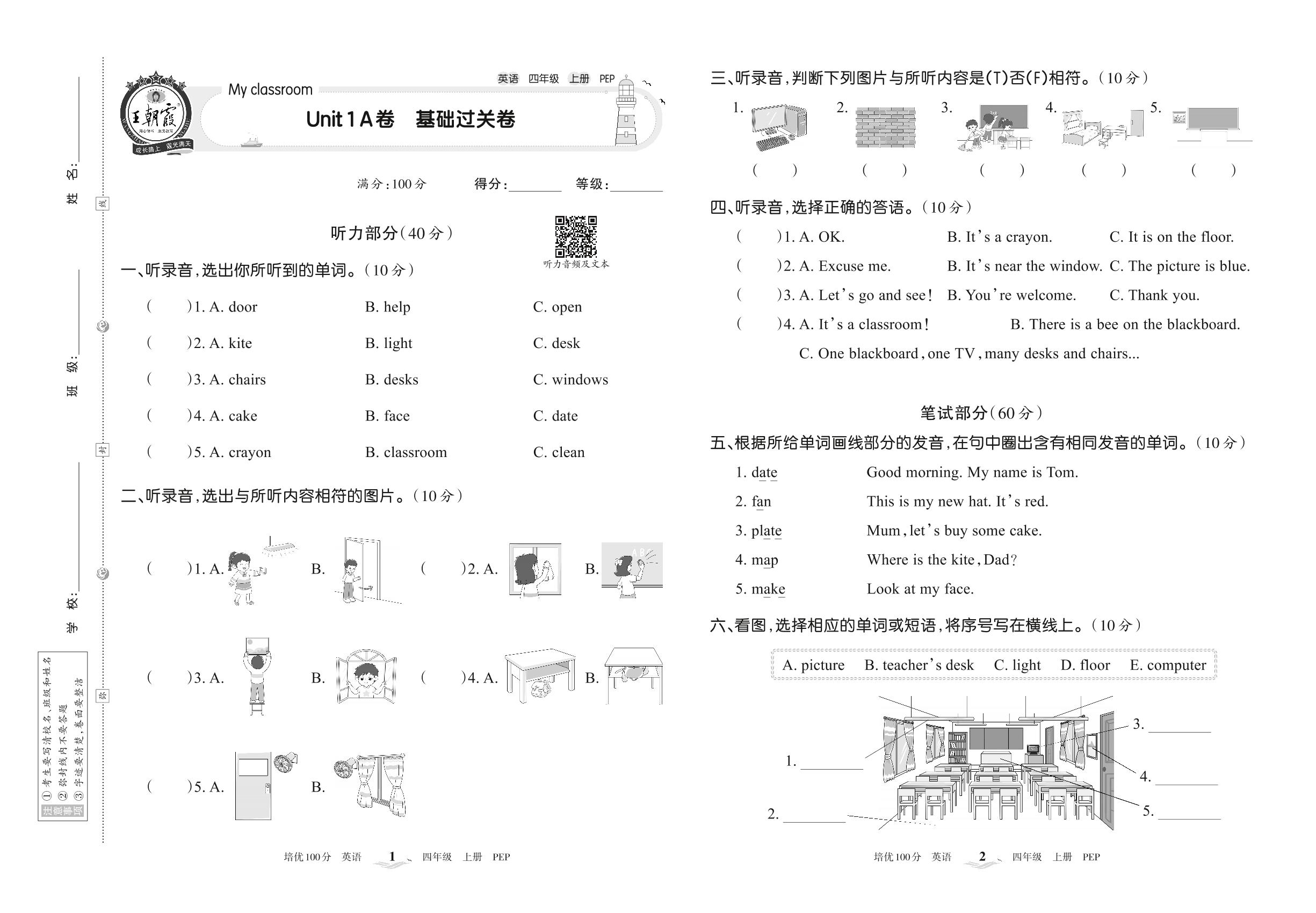 2022上册四年级英语人教PEP版 Unit 1 A卷 基础过关卷