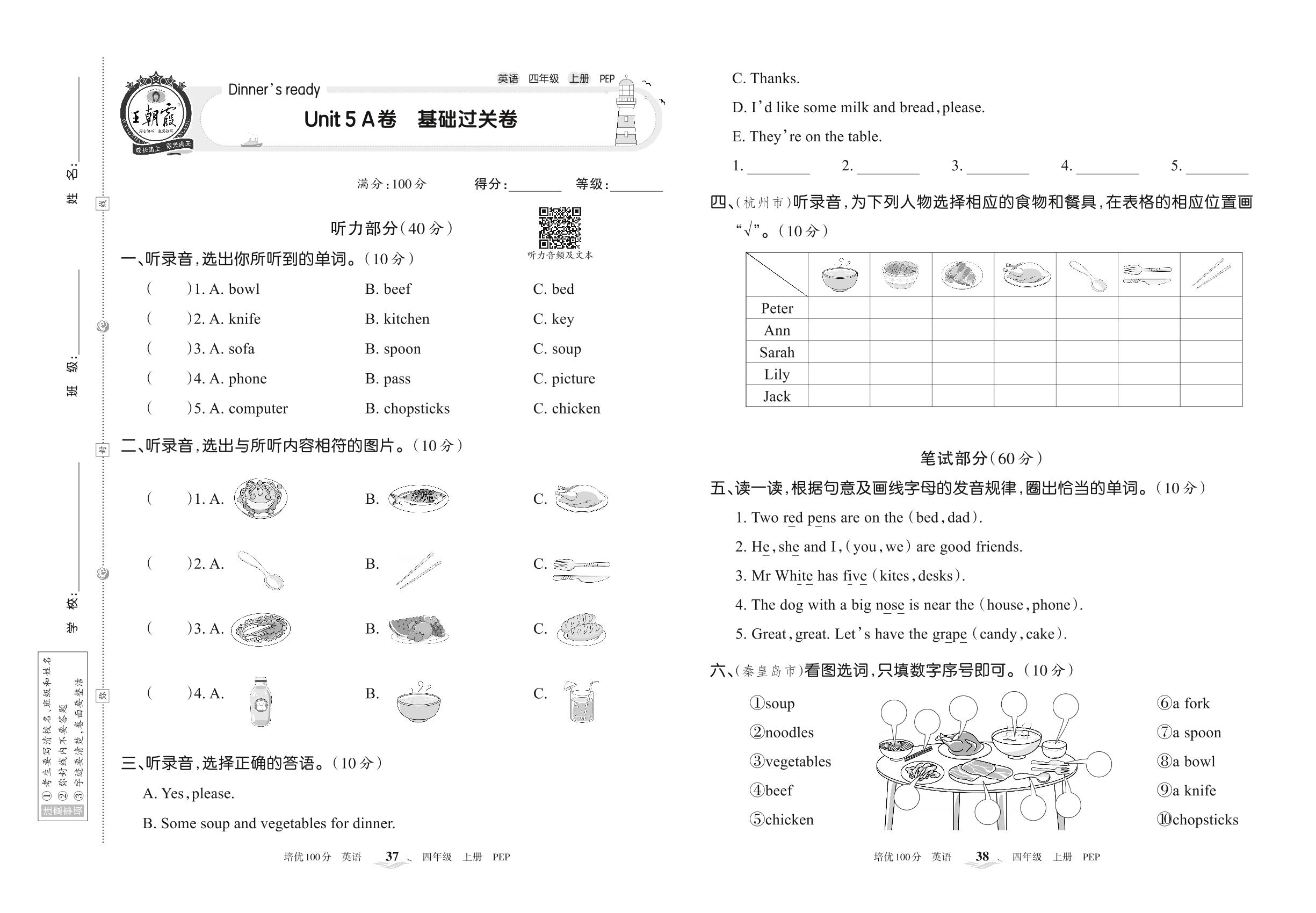 2022上册四年级英语人教PEP版 Unit 5 A卷 基础过关卷