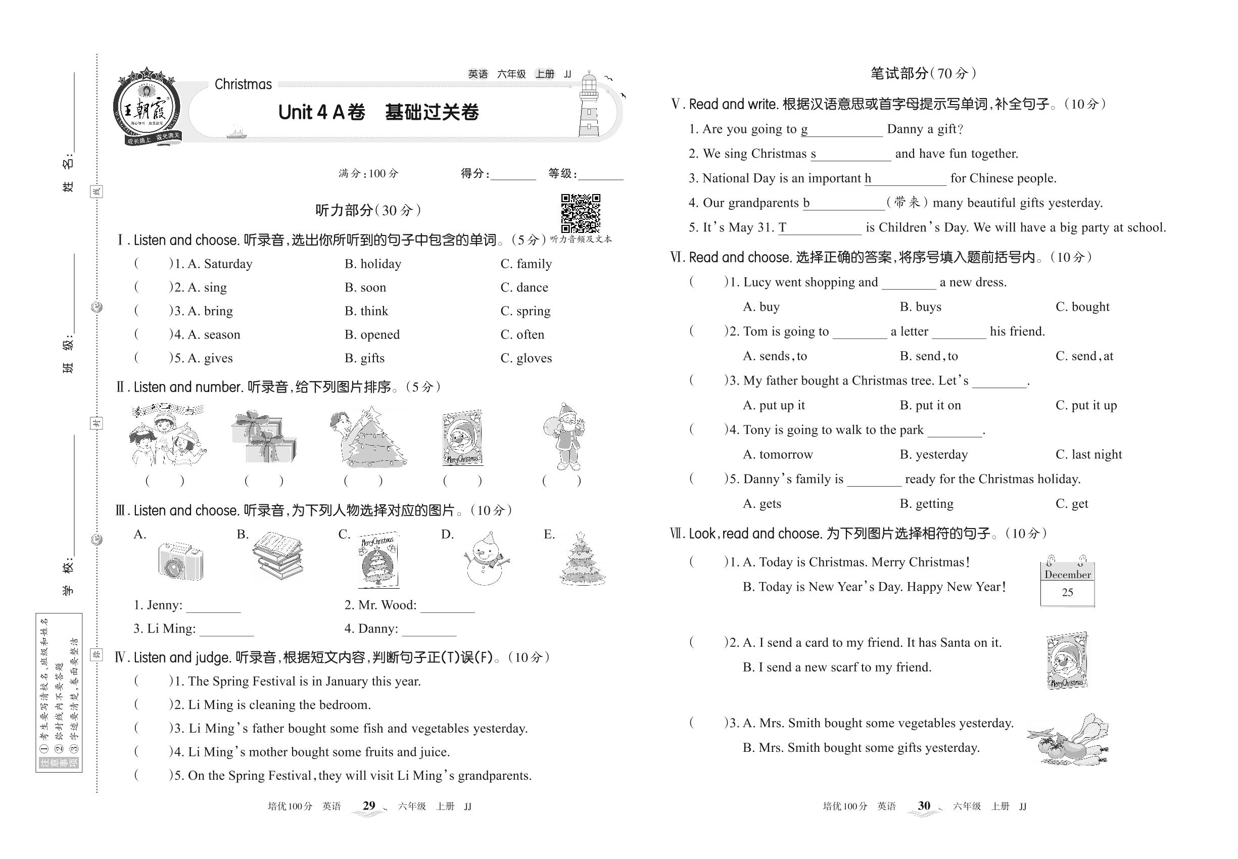 2022上册六年级英语冀教版 Unit 4 A卷 基础过关卷