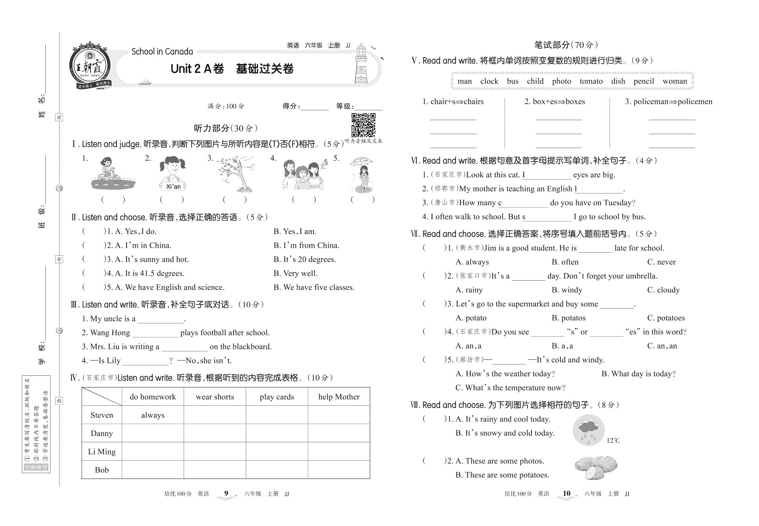 2022上册六年级英语冀教版 Unit 2 A卷 基础过关卷