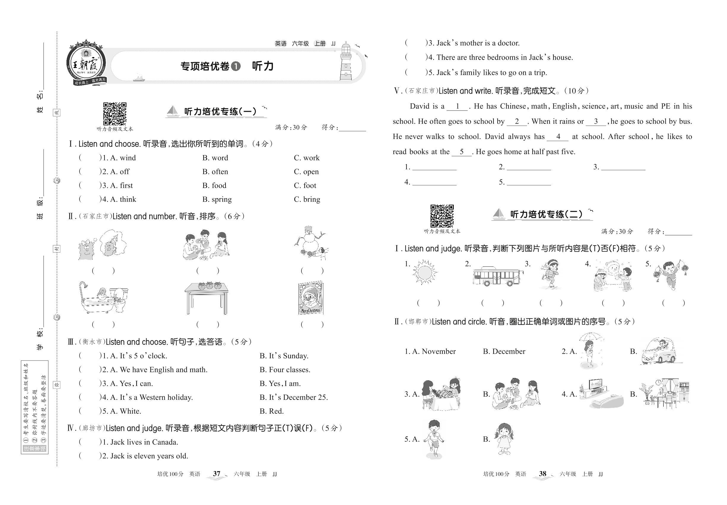 2022上册六年级英语冀教版 专项培优卷1 听力