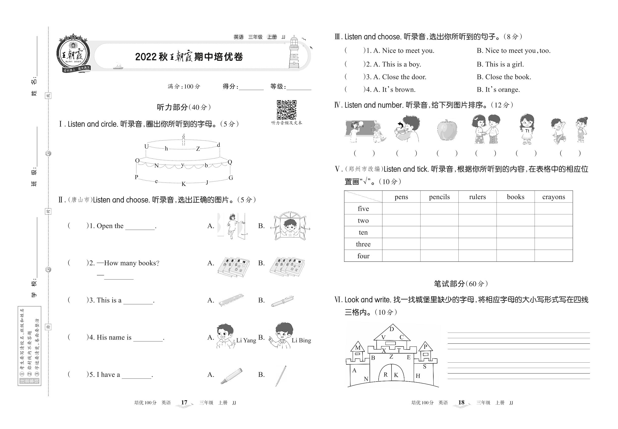 2022上册三年级英语冀教版 2022秋王朝霞期中培优卷
