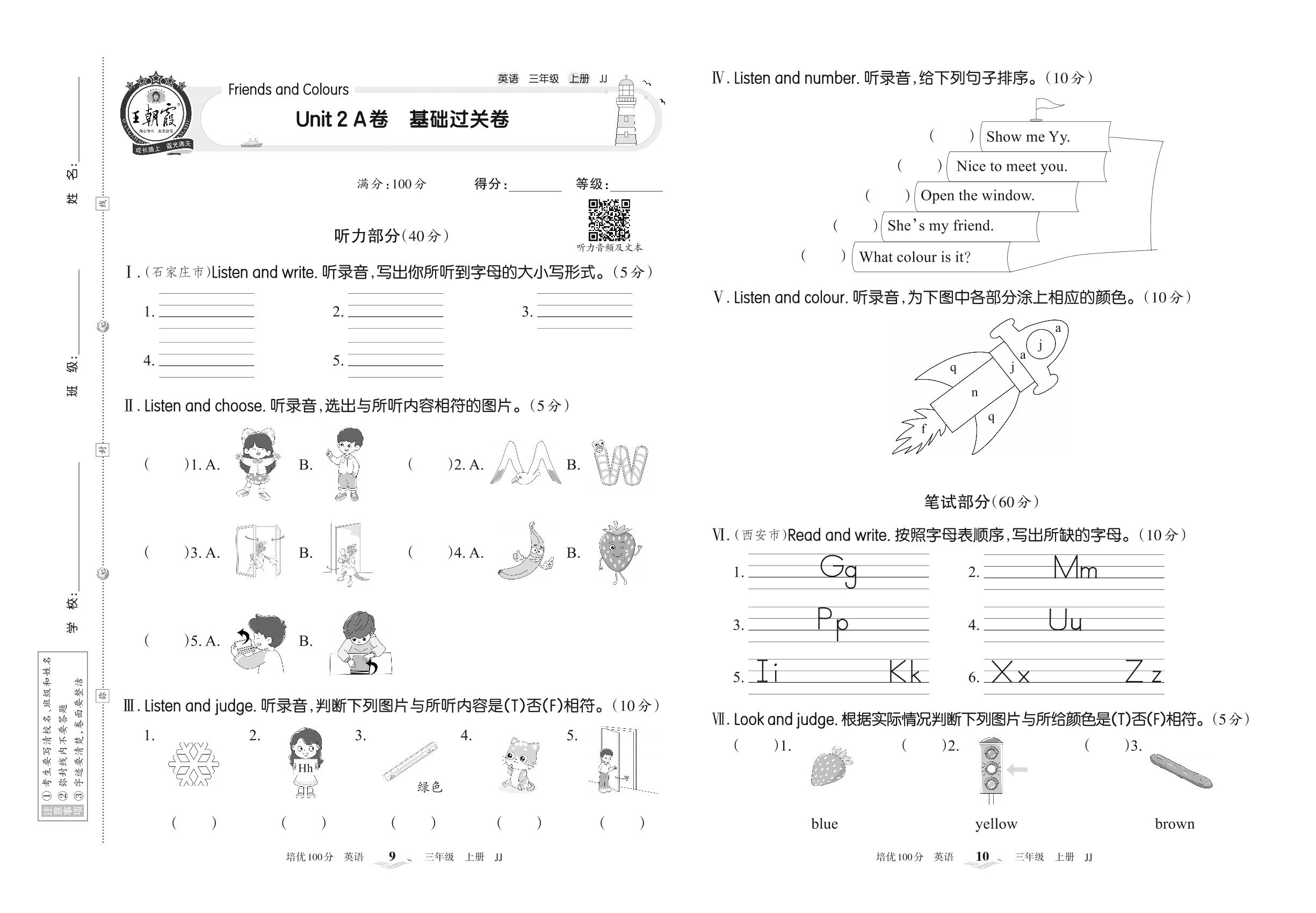 2022上册三年级英语冀教版 Unit 2 A卷 基础过关卷