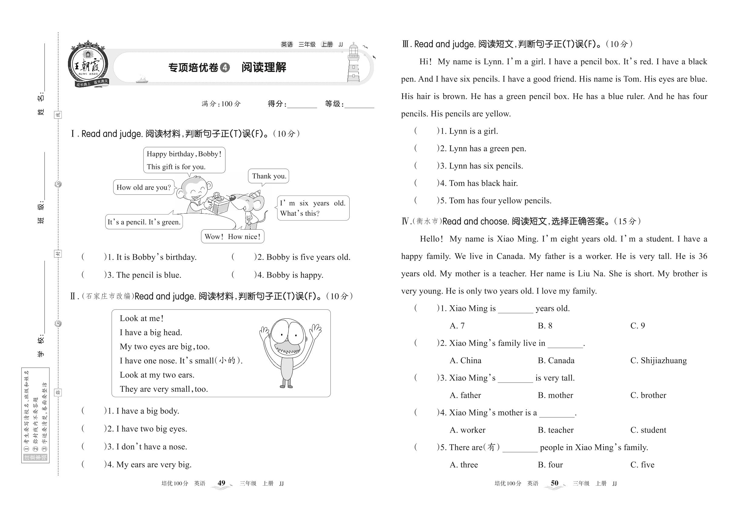 2022上册三年级英语冀教版 专项培优卷4 阅读理解