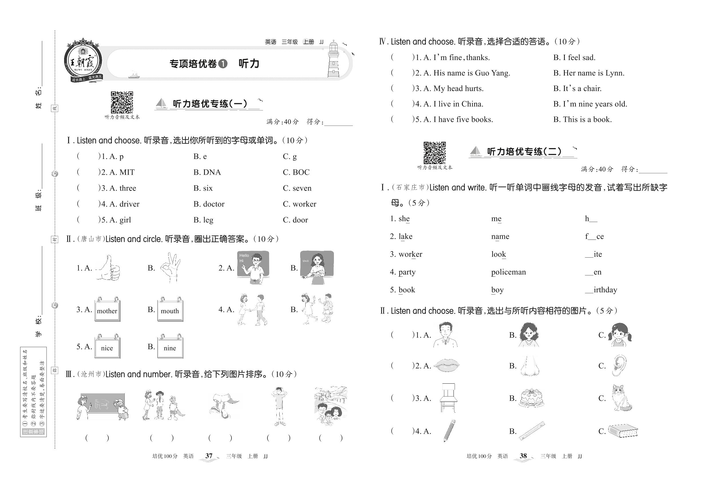 2022上册三年级英语冀教版 专项培优卷1 听力