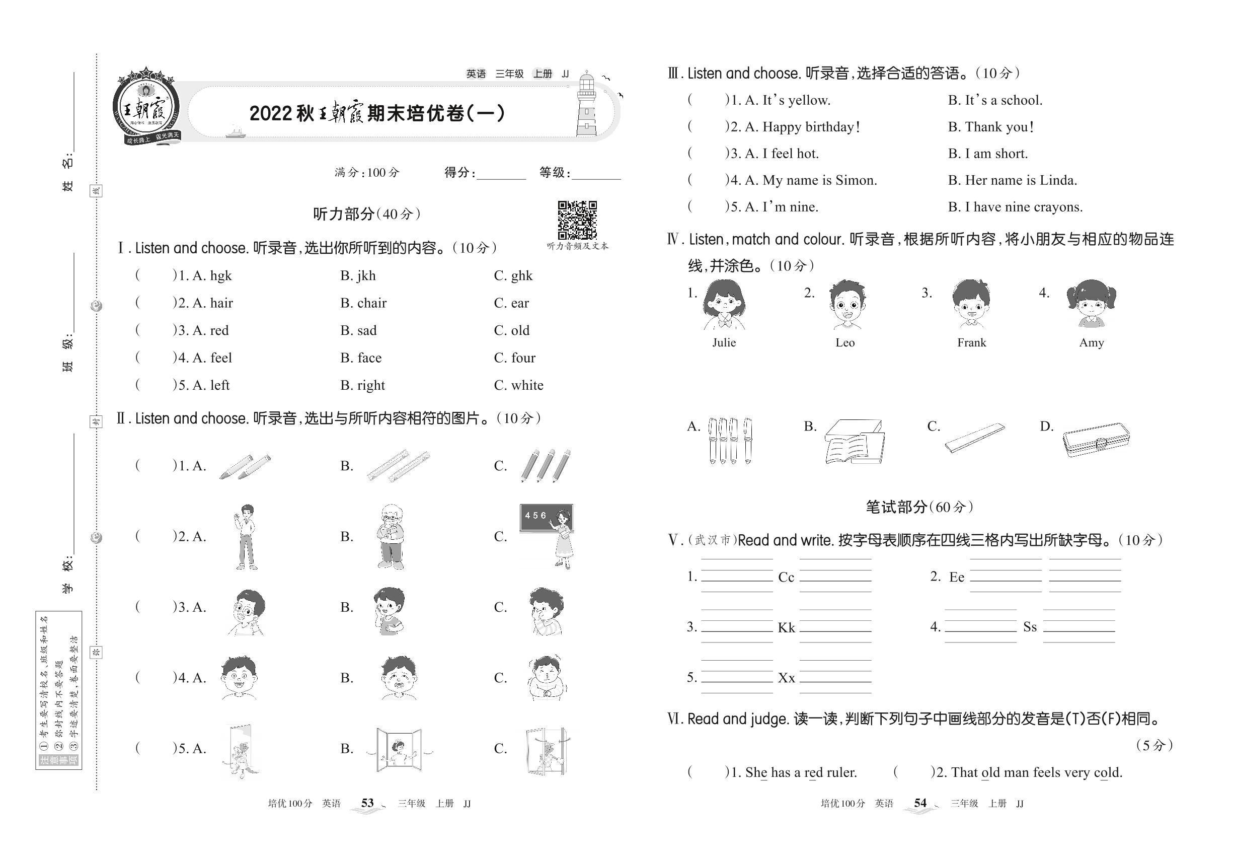 2022上册三年级英语冀教版 2022秋王朝霞期末培优卷(一)