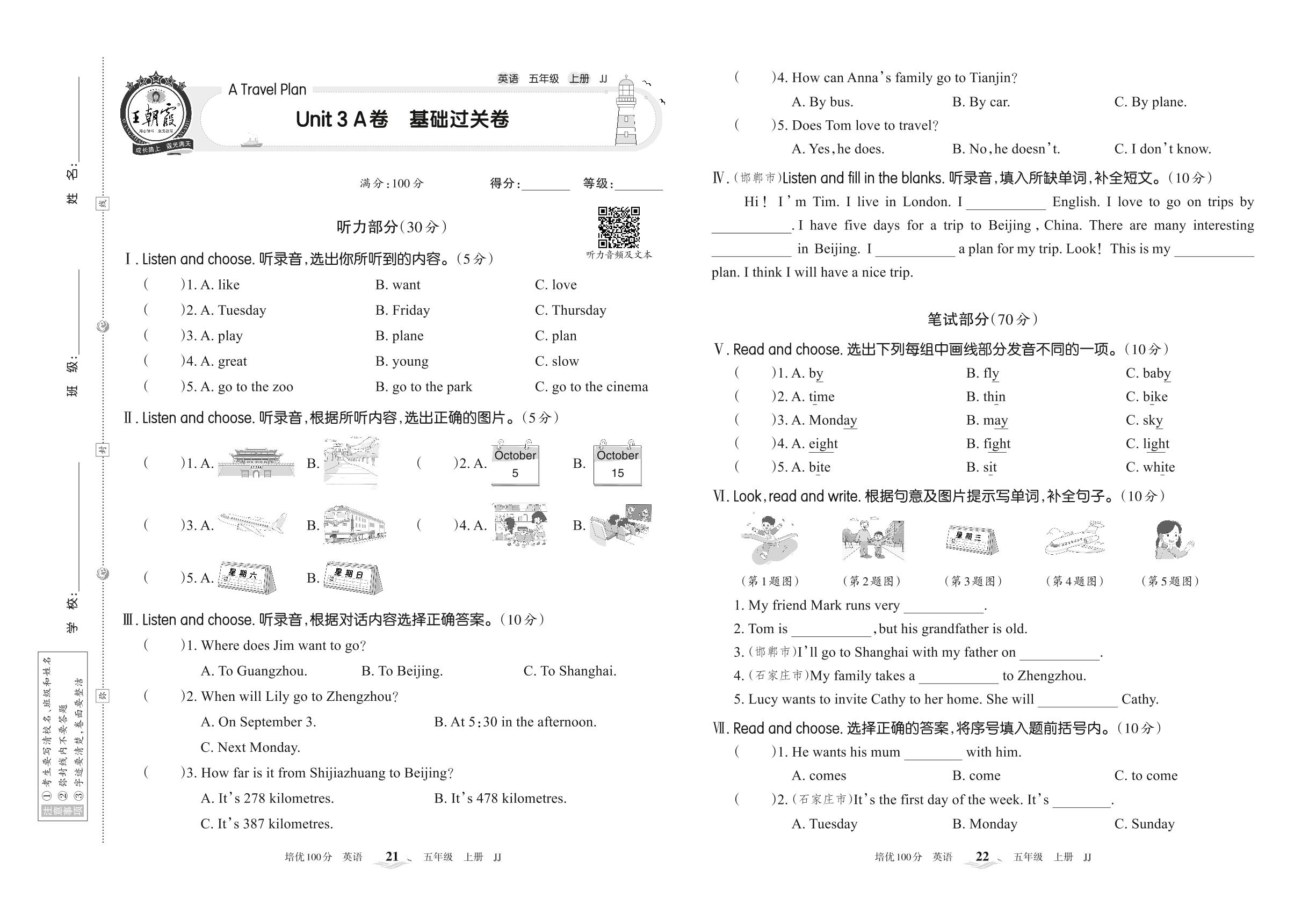 2022上册五年级英语冀教版 Unit 3 A卷 基础过关卷