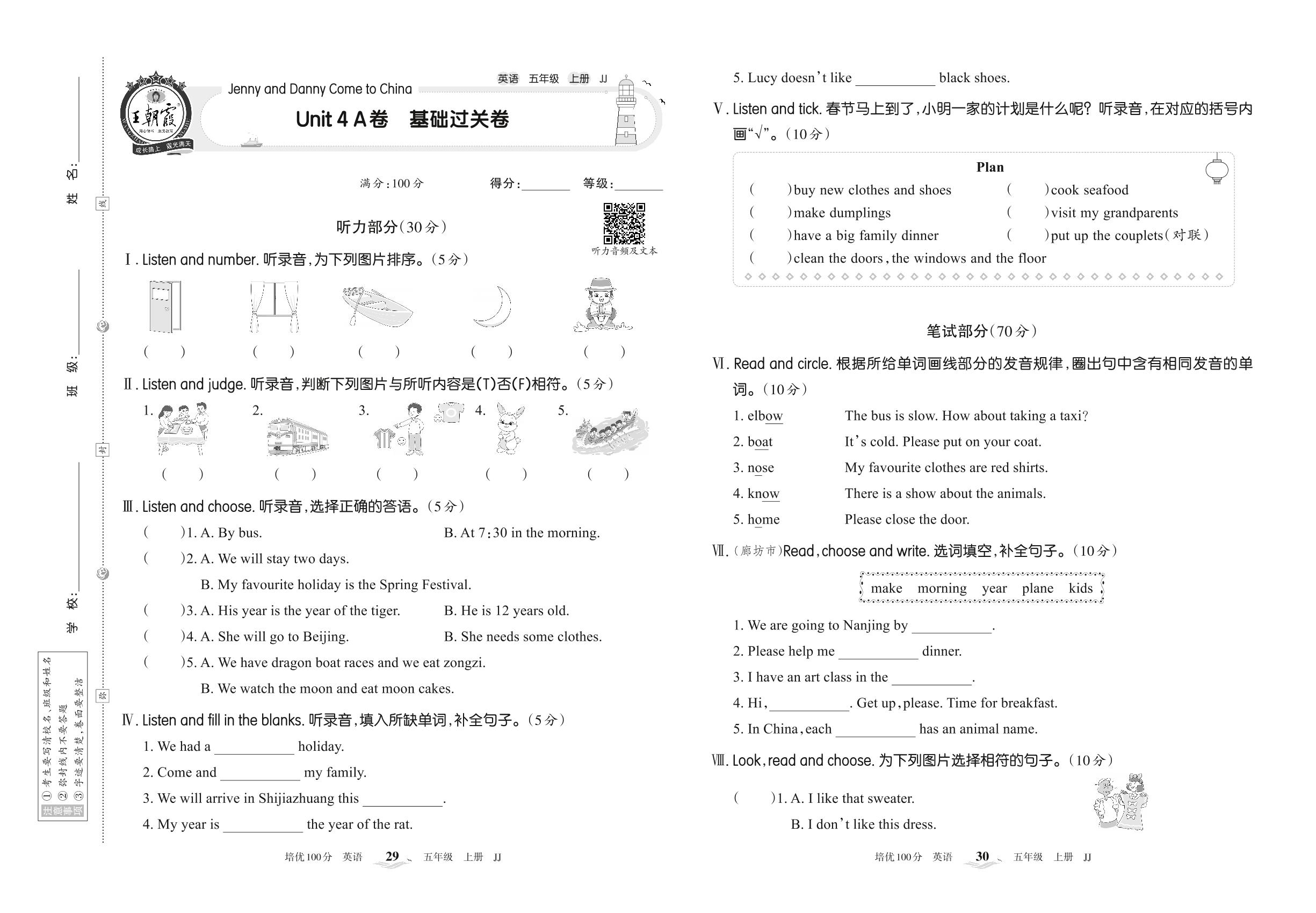 2022上册五年级英语冀教版 Unit 4 A卷 基础过关卷