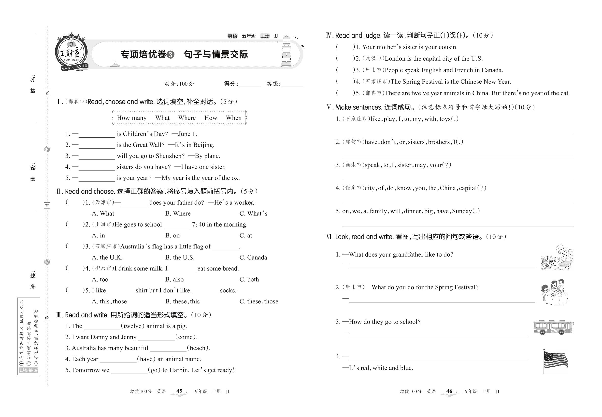 2022上册五年级英语冀教版 专项培优卷3 句子与情景交际