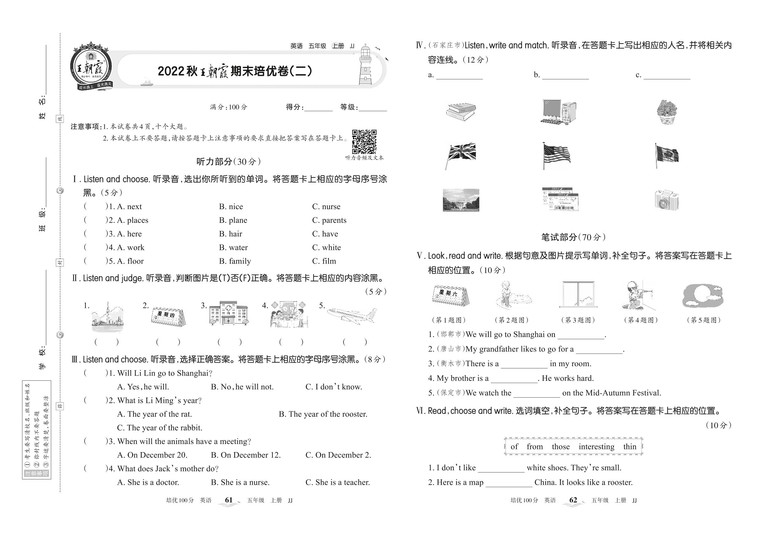 2022上册五年级英语冀教版 2022秋王朝霞期末培优卷(二)