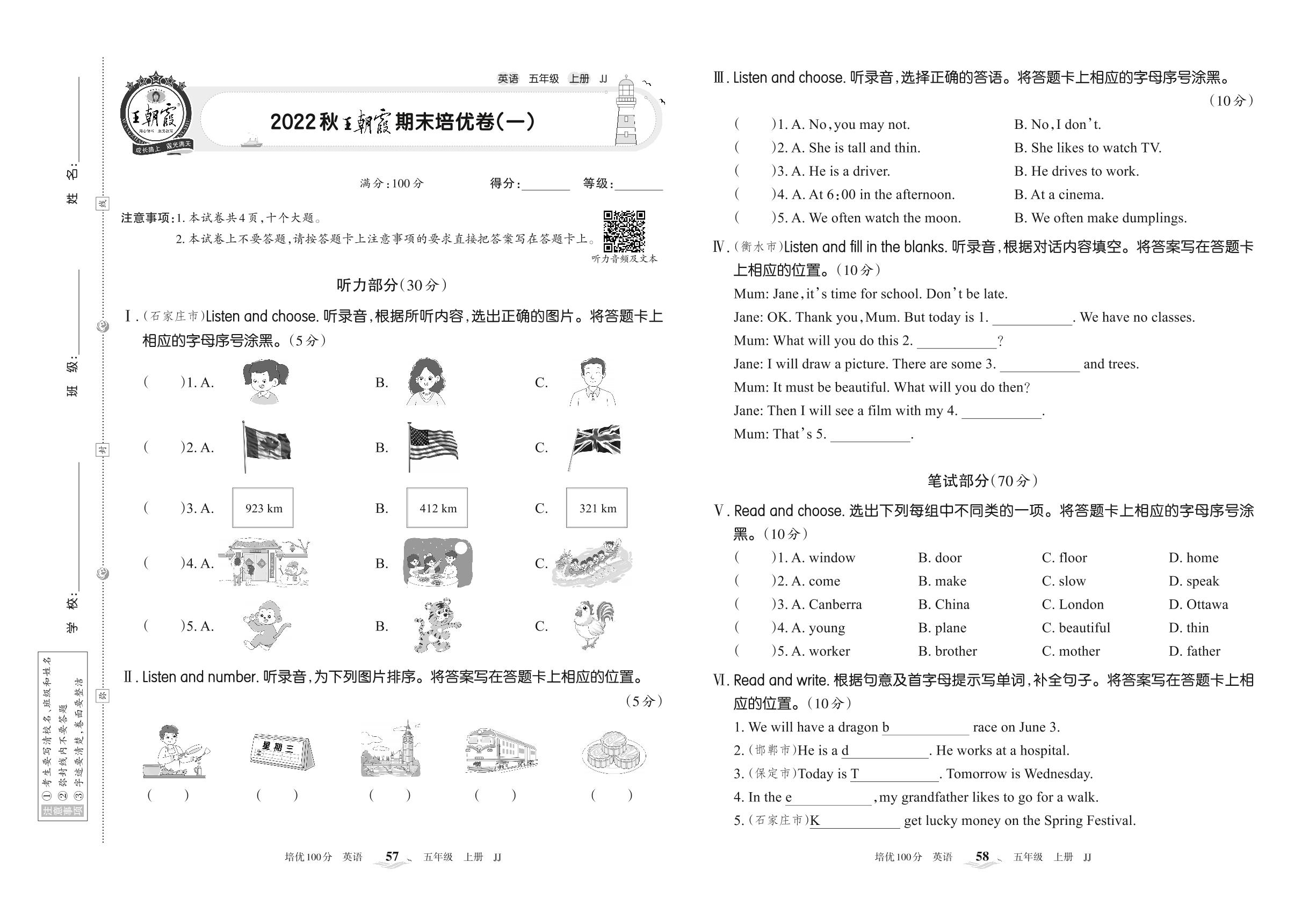 2022上册五年级英语冀教版 2022秋王朝霞期末培优卷(一)