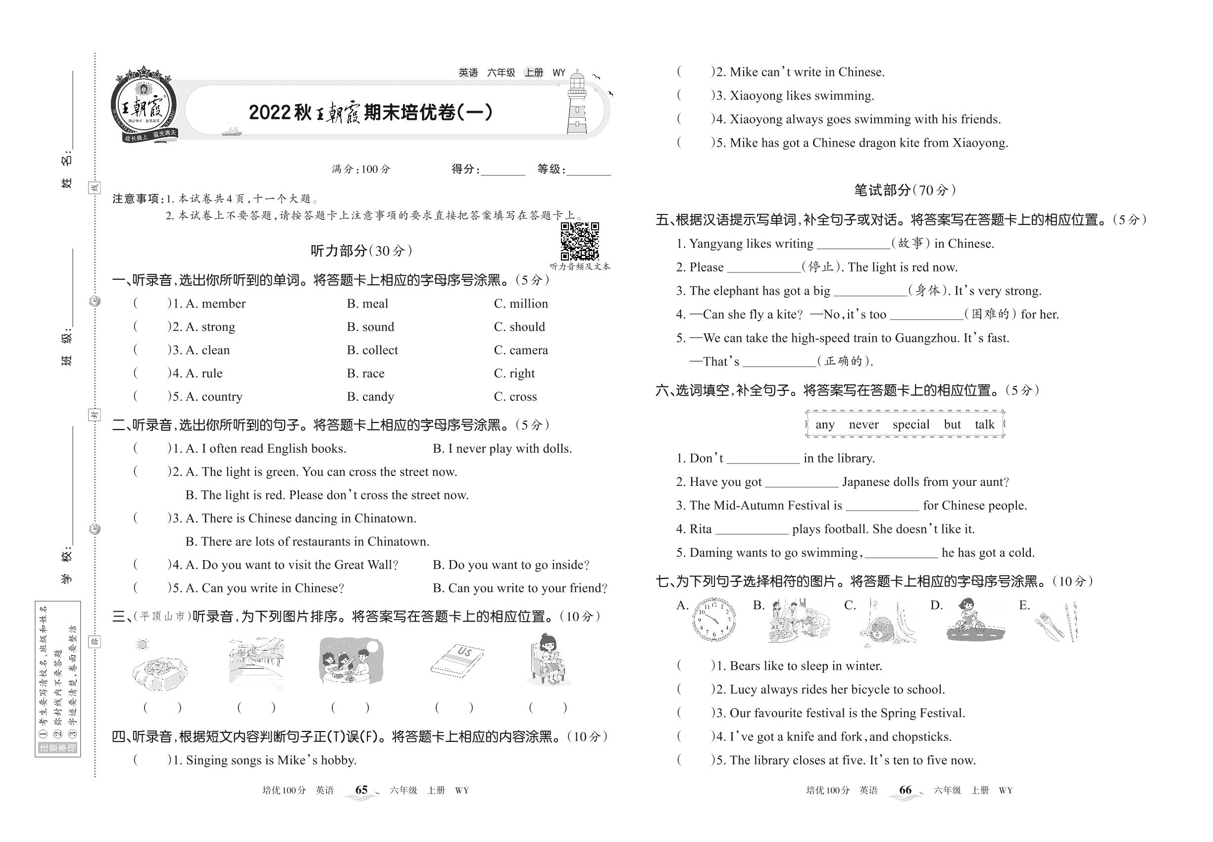 2022上册六年级英语外研版 2022秋王朝霞期末培优卷(一)