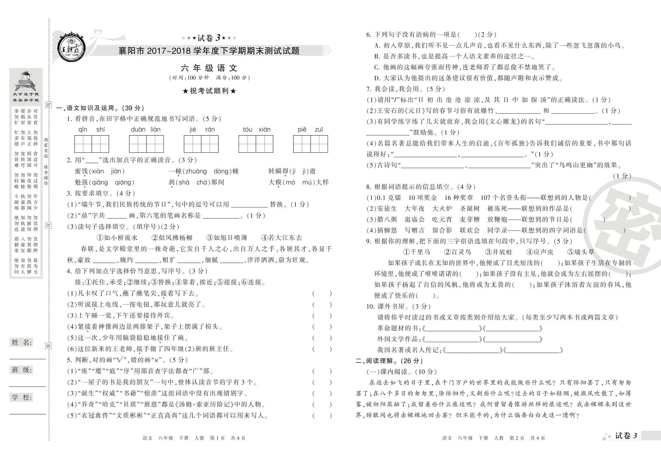 2017-2018学年第二学期襄阳市六年级语文试卷(人教版)【3】