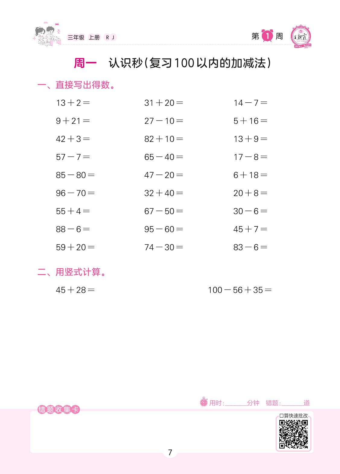 2022上册三年级数学人教版 第1周 周一