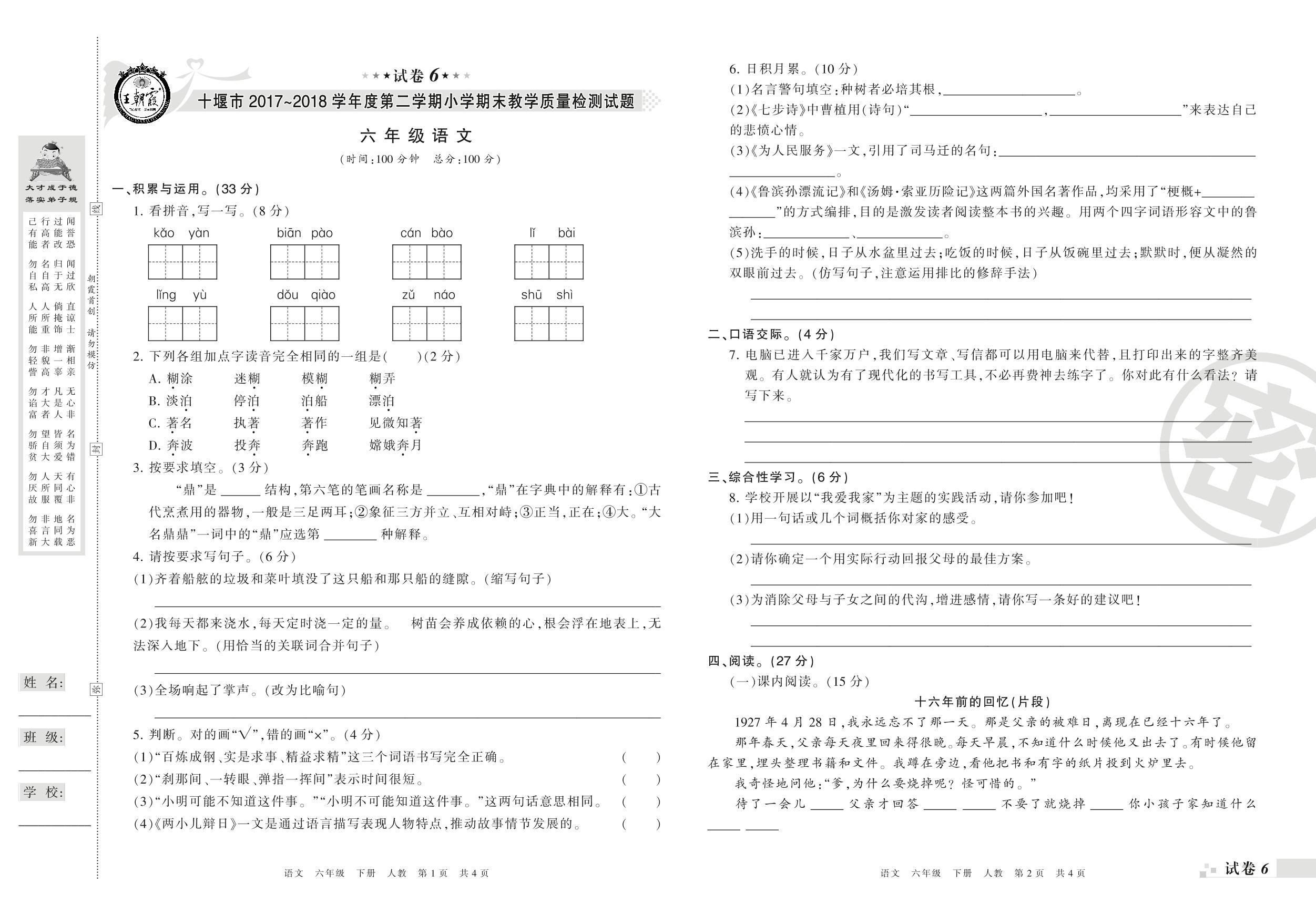 2017-2018学年第二学期十堰市六年级语文试卷(人教版)【6】