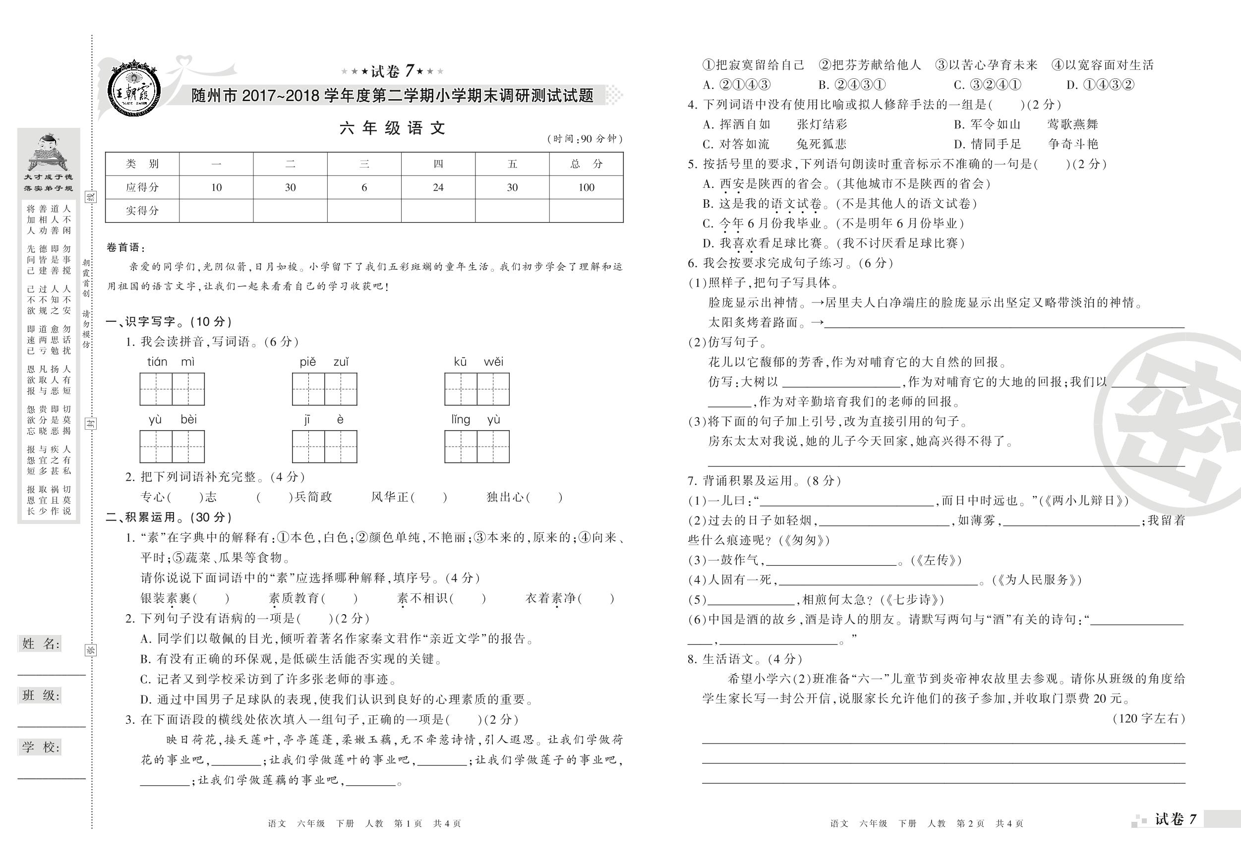2017-2018学年第二学期随州市六年级语文试卷(人教版)【7】