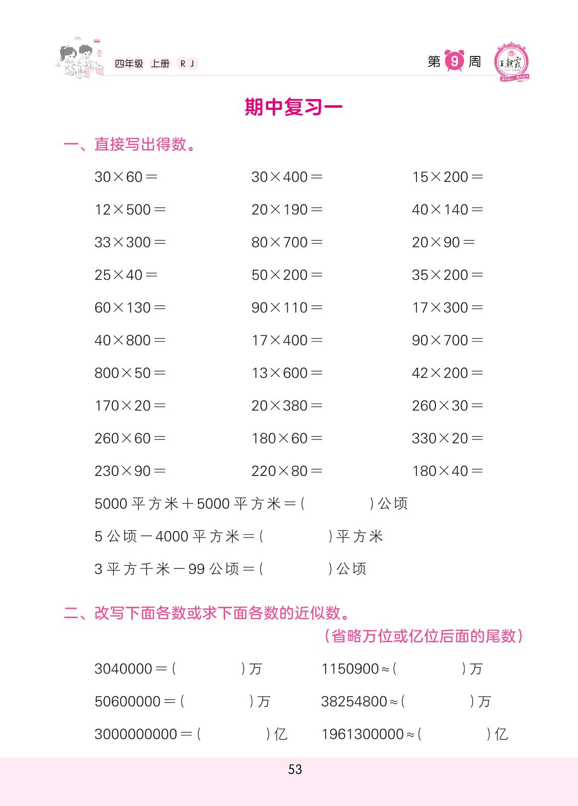 2022上册四年级数学人教版 第9周 期中复习一(计算专练)