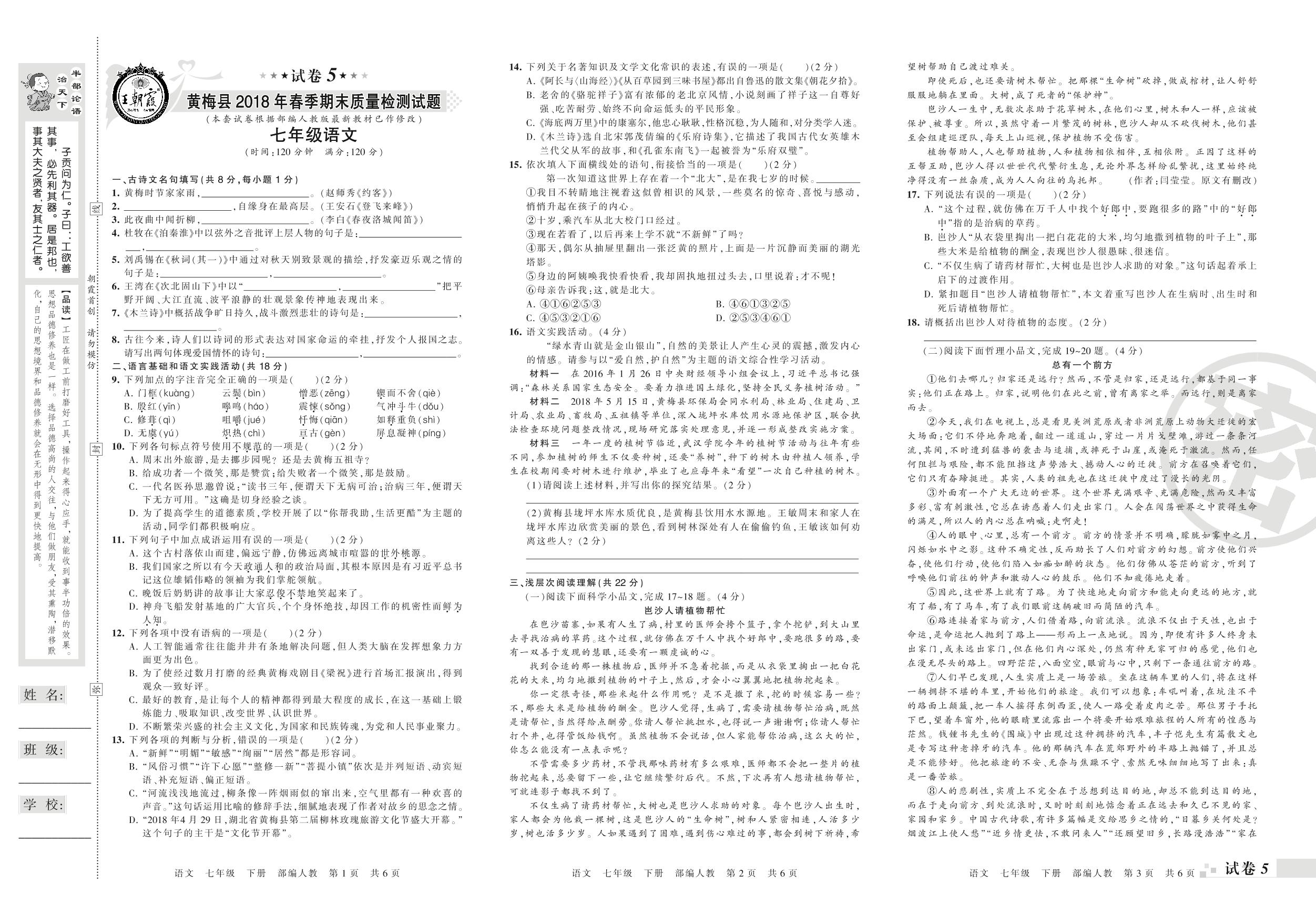 2017-2018学年第二学期黄冈市黄梅县七年级语文试卷(人教版)【5】