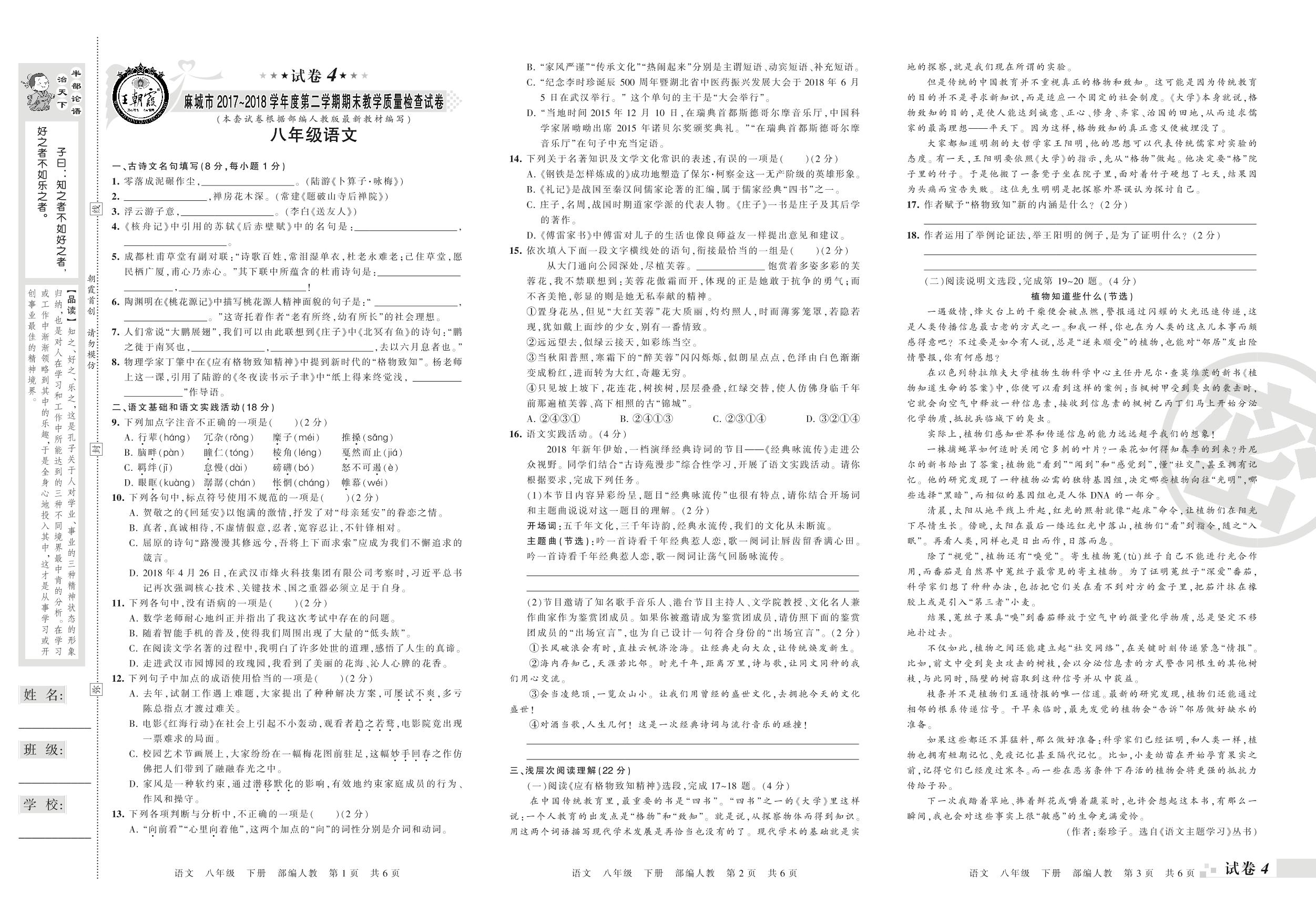 2017-2018学年第二学期麻城市八年级语文试卷(人教版)【4】