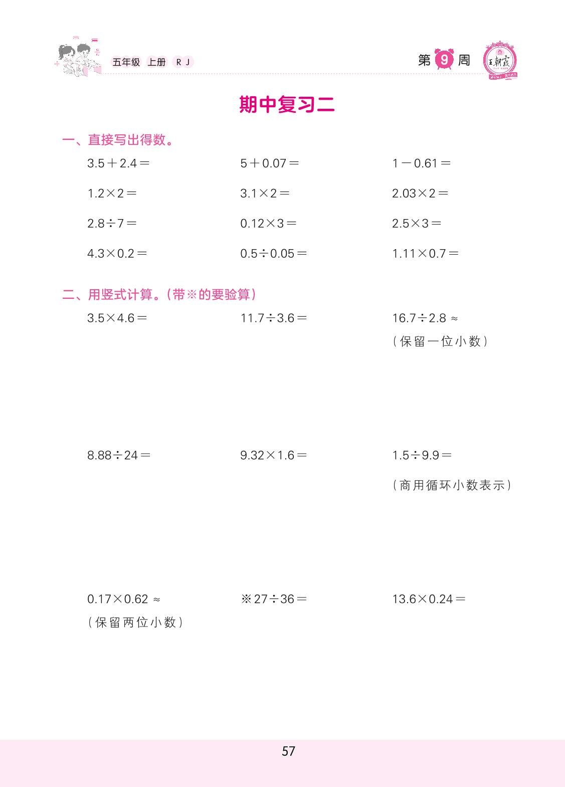 2022上册五年级数学人教版 第9周 期中复习二(计算专练)