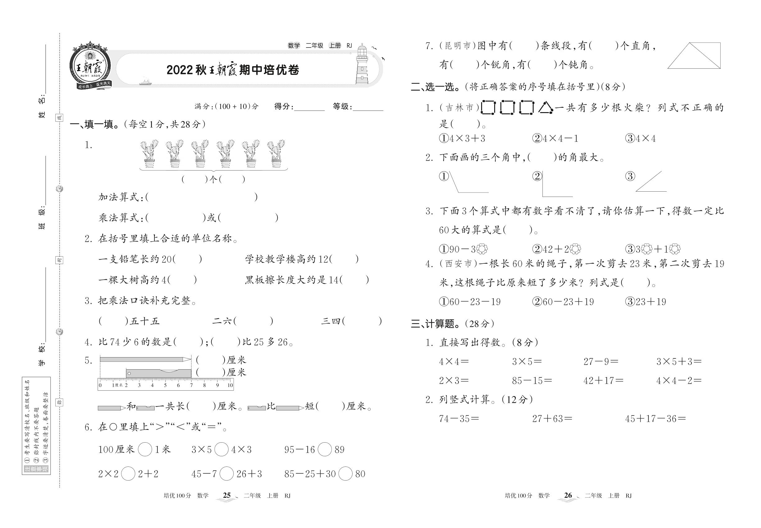 2022上册二年级数学人教版 2022秋王朝霞期中培优卷