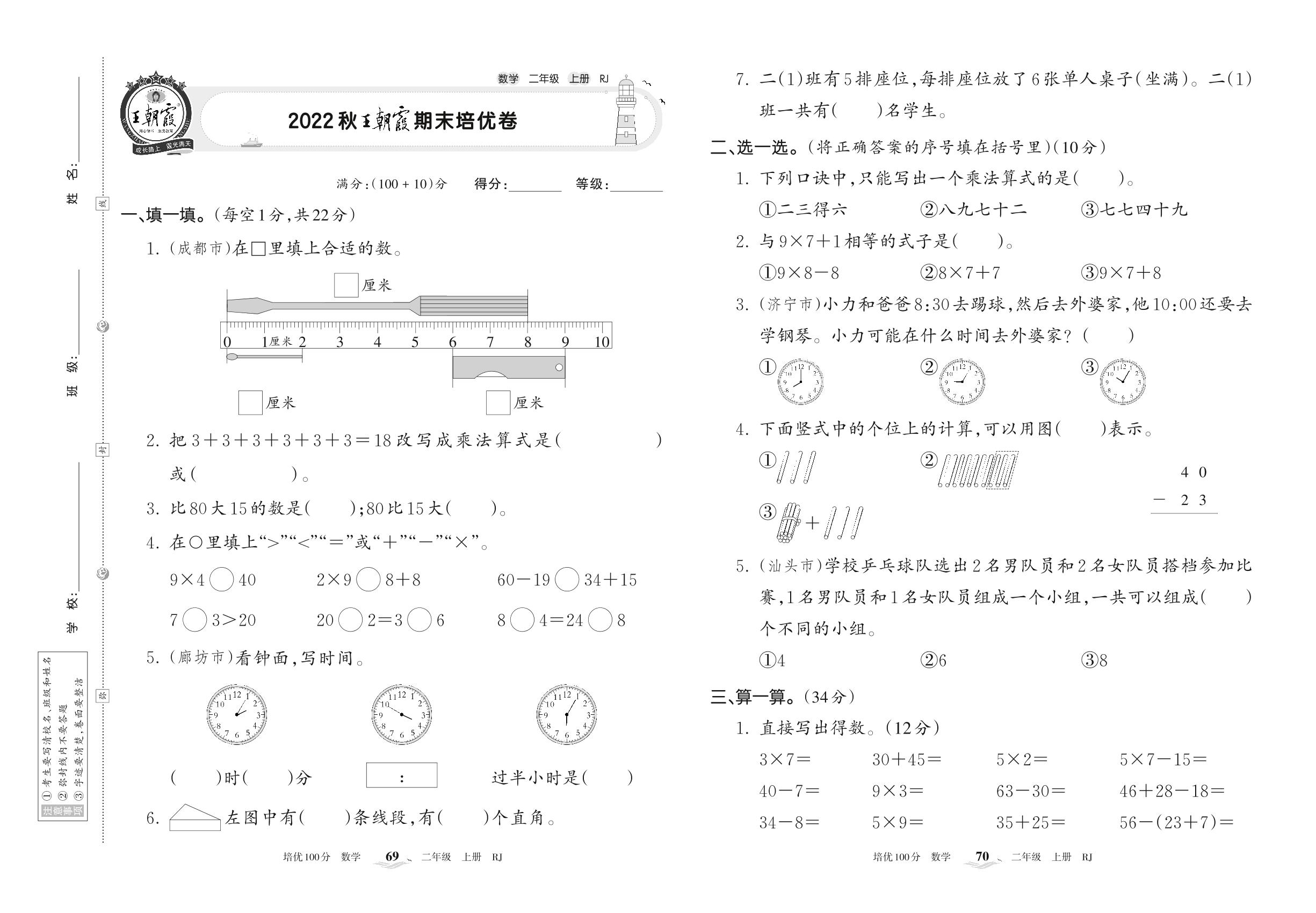 2022上册二年级数学人教版 2022秋王朝霞期末培优卷