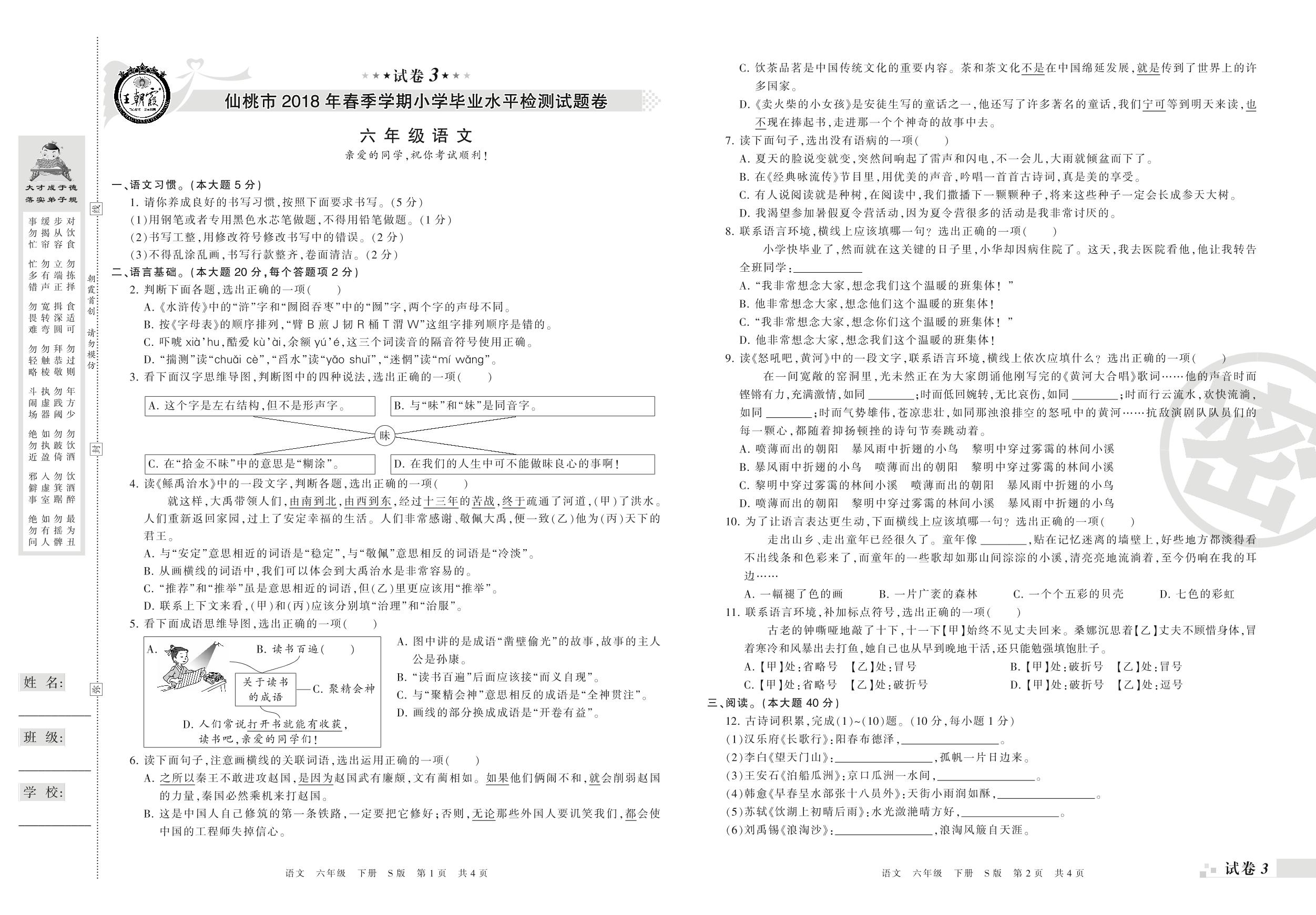 2017-2018学年第二学期仙桃市六年级语文试卷(S版)【3】